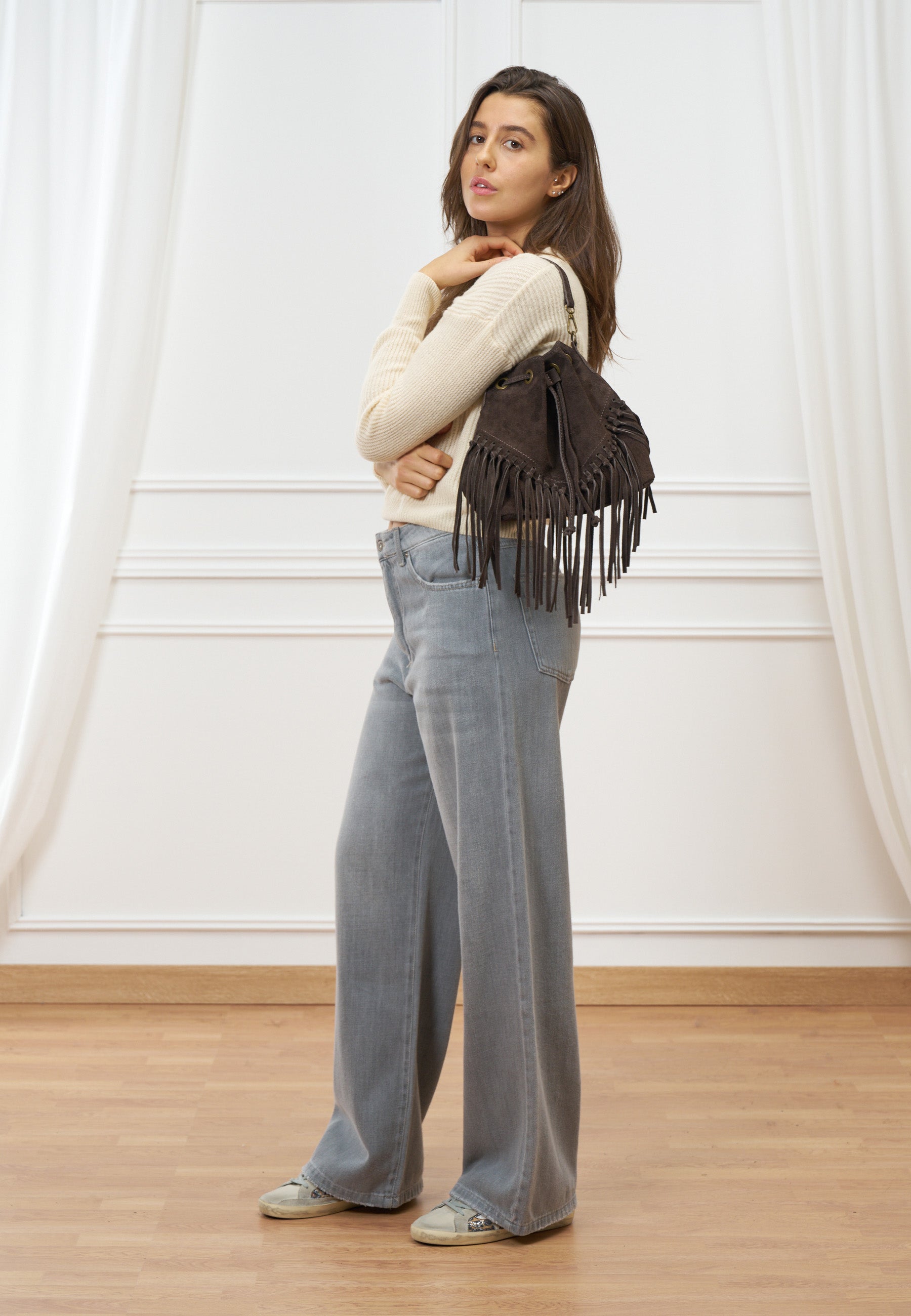Di tendenza e dallo spirito boho-chic, questa borsa secchiello in pelle unisce eleganza e praticità in un design artigianale dal carattere unico.