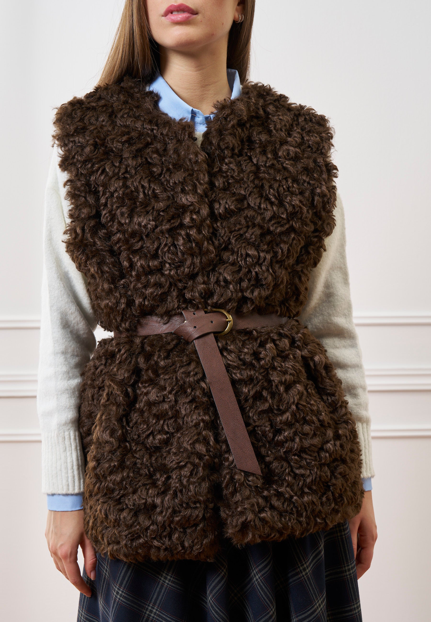 Avvolgente e contemporaneo, questo cappotto smanicato in ecopelliccia unisce comfort e stile in un design moderno e versatile.