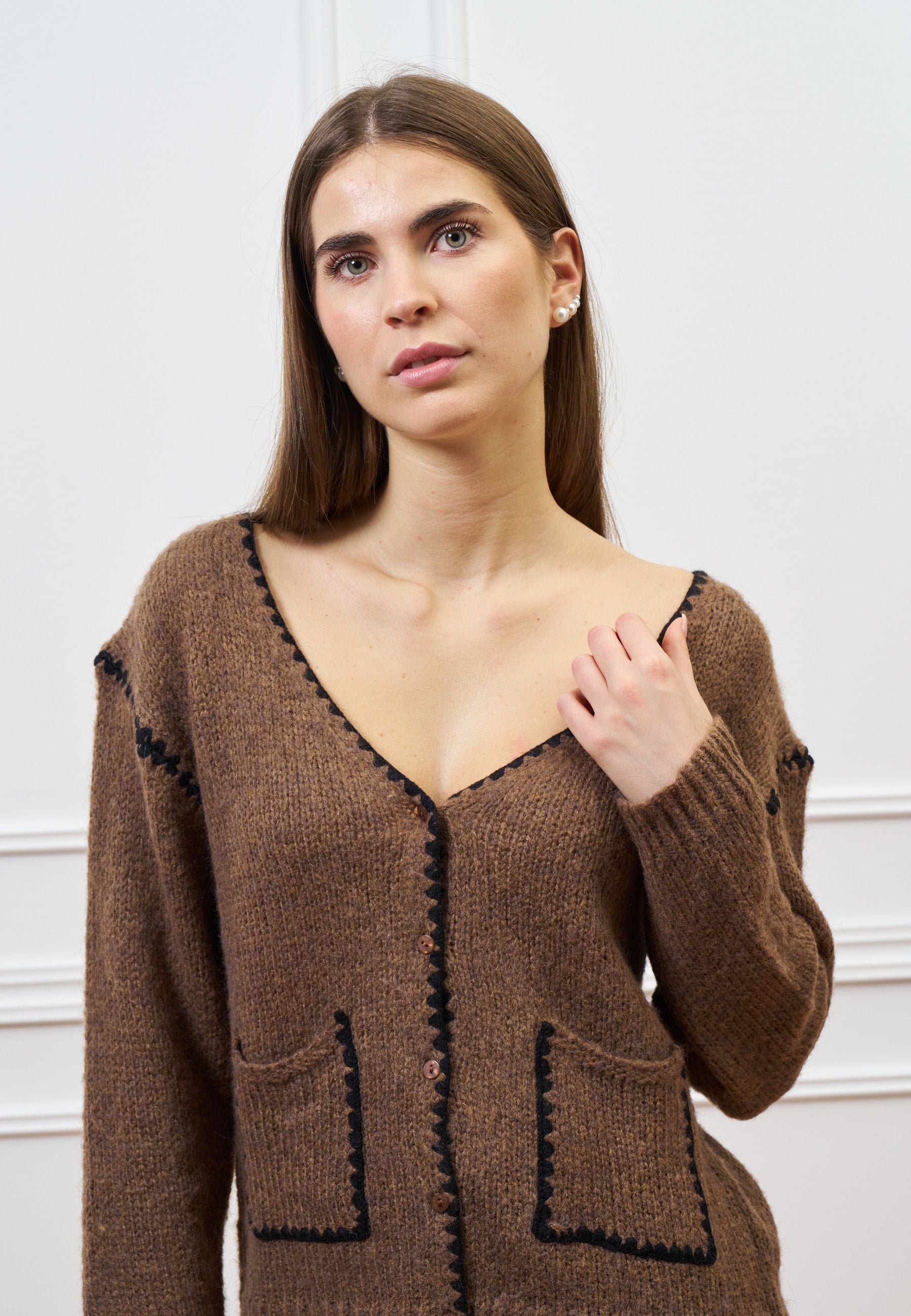 Caldo e avvolgente, questo cardigan si distingue per i profili a contrasto che ne esaltano le linee, donando un tocco di raffinatezza contemporanea.