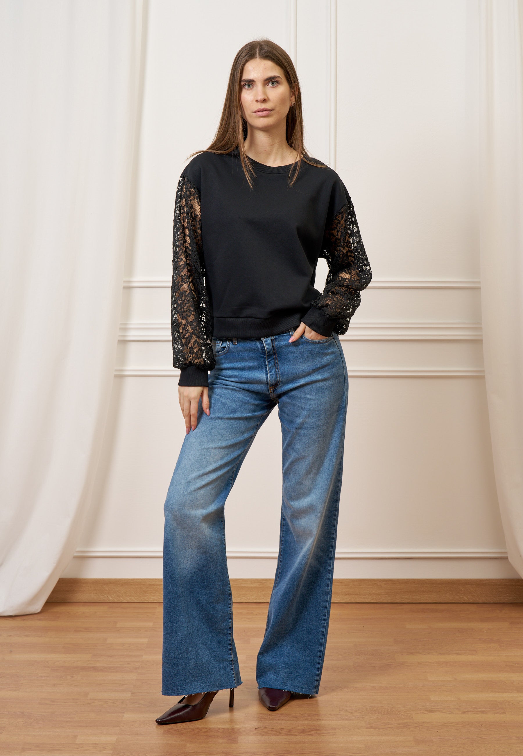 Eleganza e comfort si fondono in questa felpa dal carattere romantico, caratterizzata da maniche lunghe in pizzo traforato che aggiungono leggerezza e femminilità.