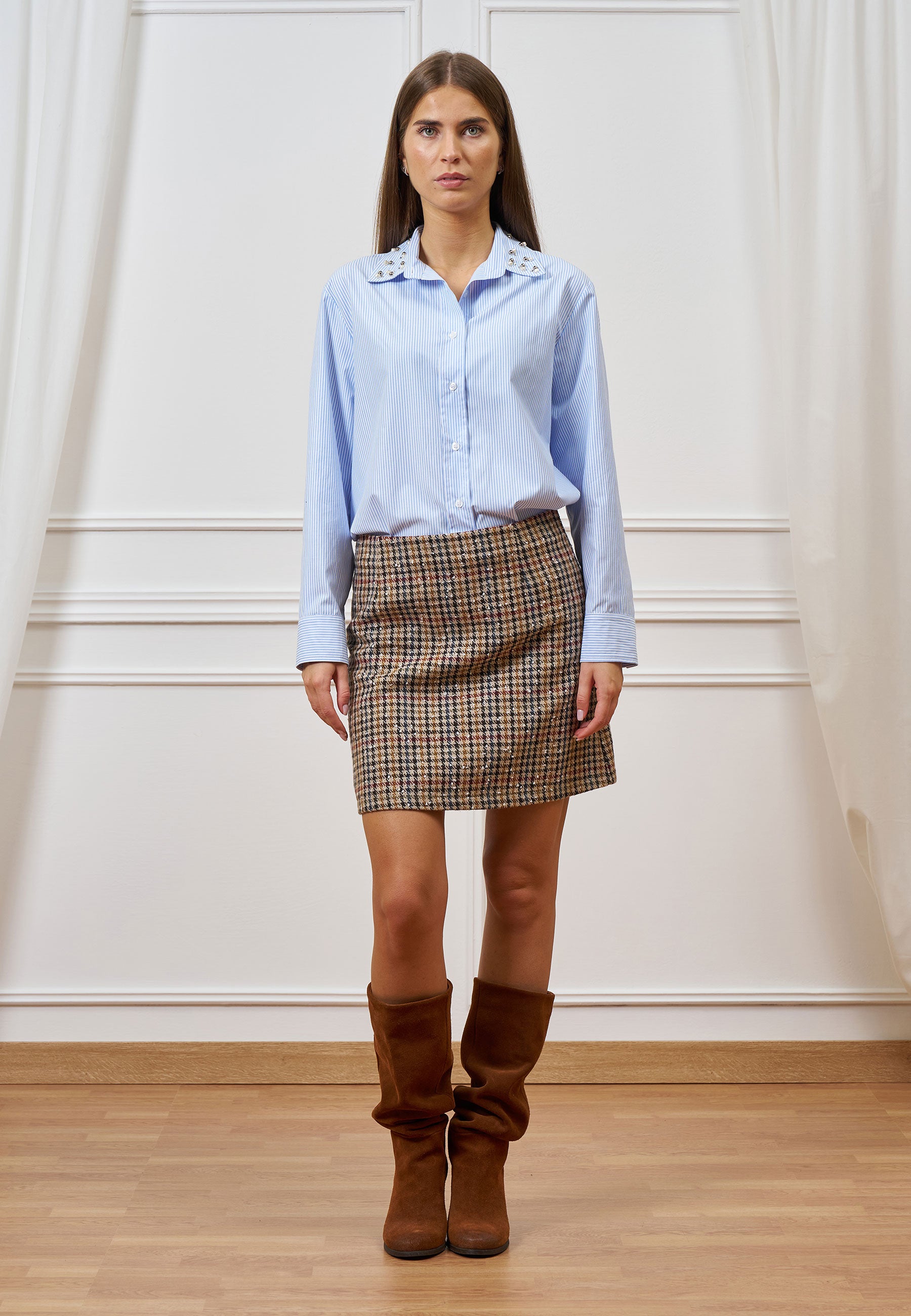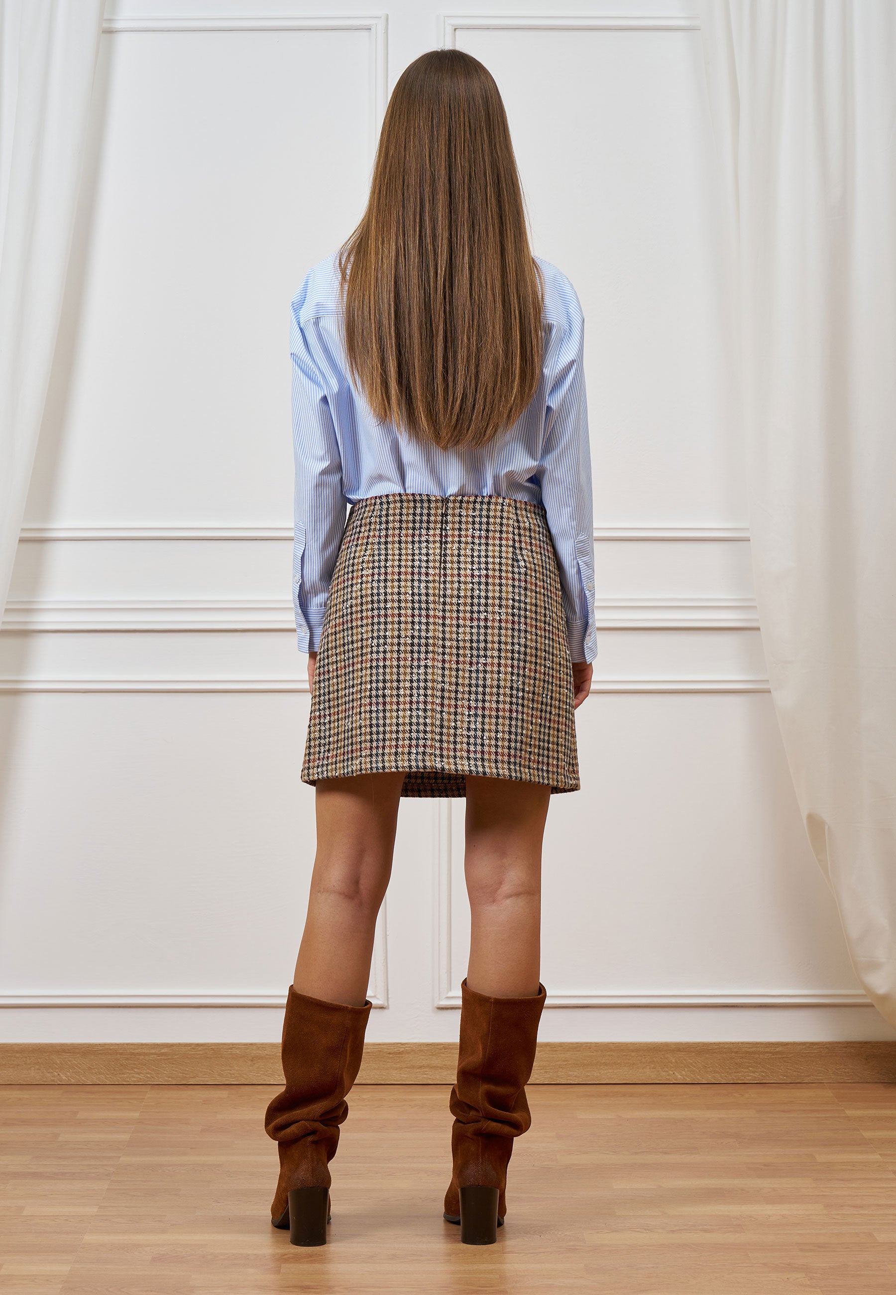 Linee pulite e femminilità si incontrano in questa gonna dal design essenziale e raffinato.