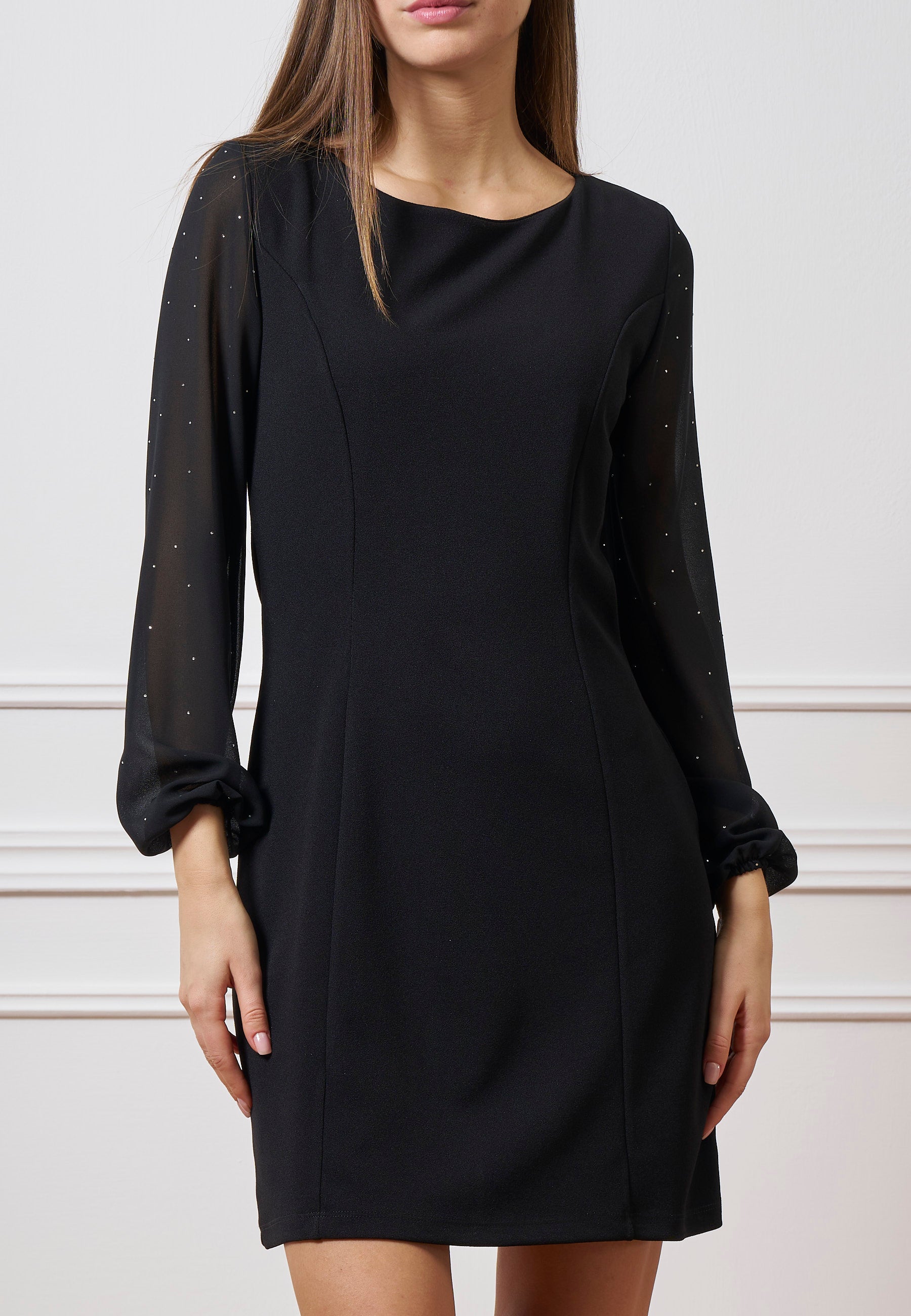 Romantico e femminile, questo vestito corto è impreziosito da maniche in tulle rifinite da piccoli strass che aggiungono luce e raffinatezza al look.