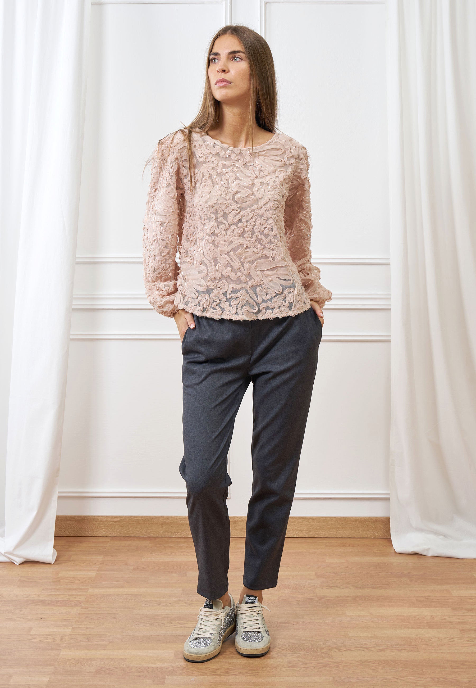 • Tessuto semitrasparente con ricami a rilievo e paillettes