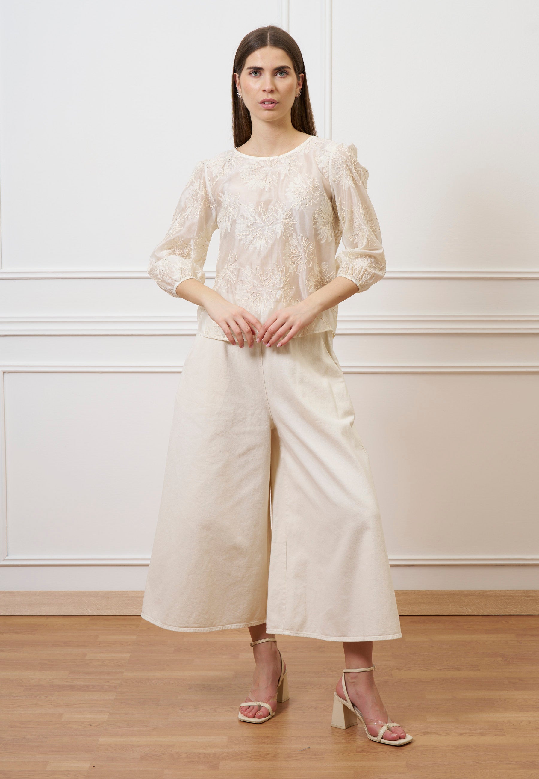 Ricami delicati e mussola leggera definiscono una blusa dal fascino naturale, pensata per valorizzare outfit sia quotidiani sia più ricercati.