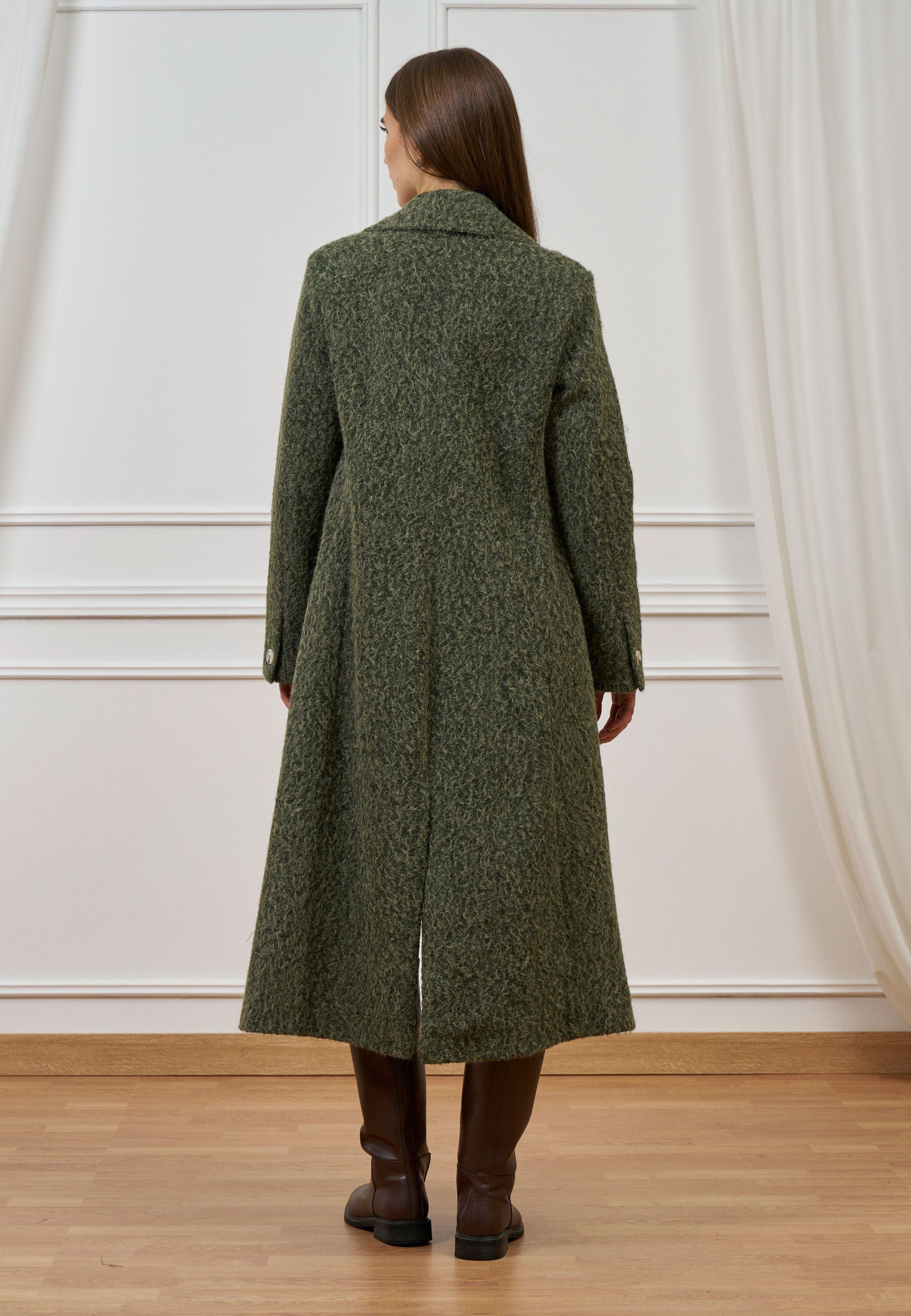 Un capo unico che unisce la tradizione sartoriale a un tessuto bouclé materico e morbido al tatto, ideale per affrontare l’inverno con stile.