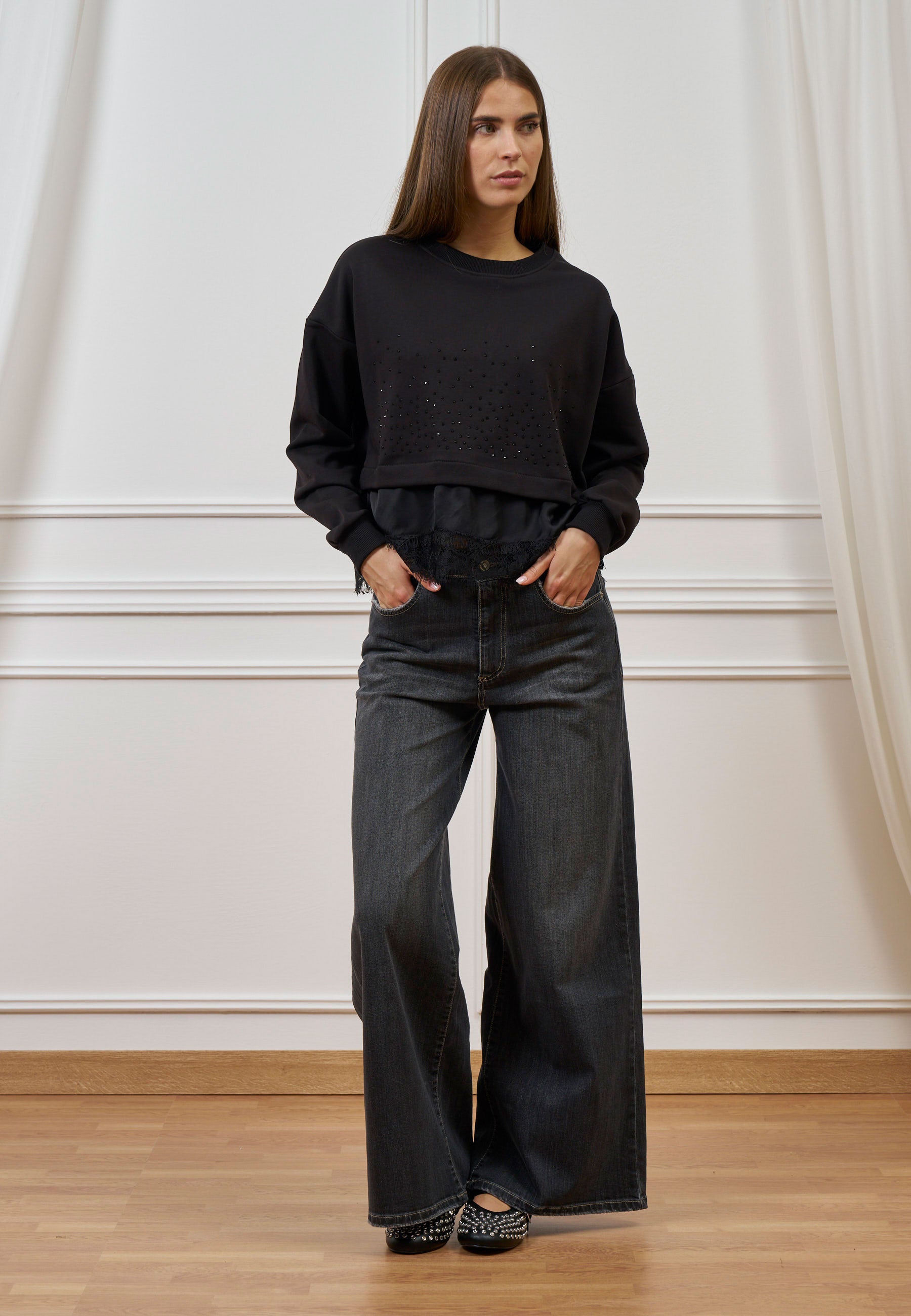 Pulizia estetica e dettagli femminili si incontrano in questa felpa dal design moderno, impreziosita da strass e inserto d pizzo sul fondo.
