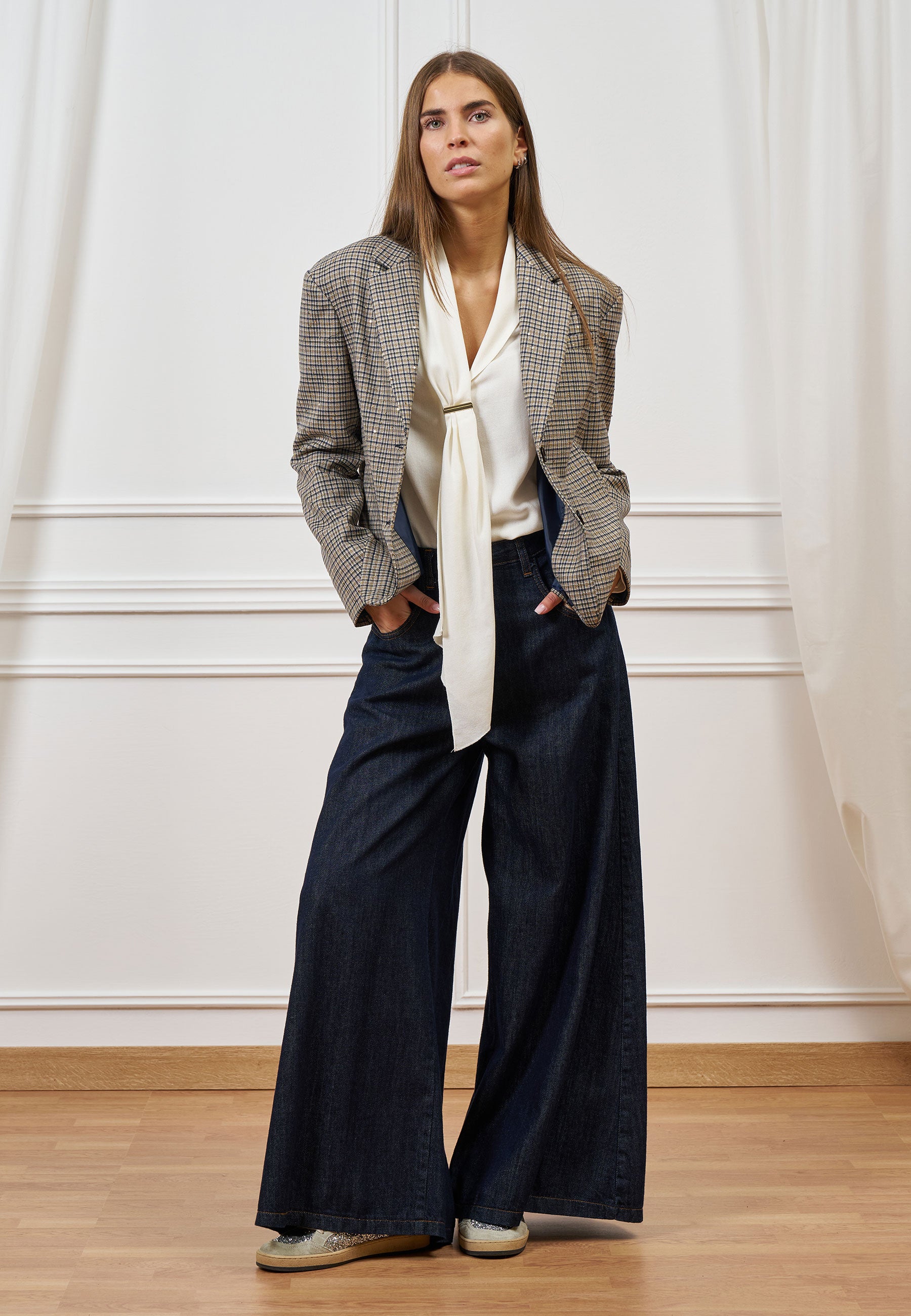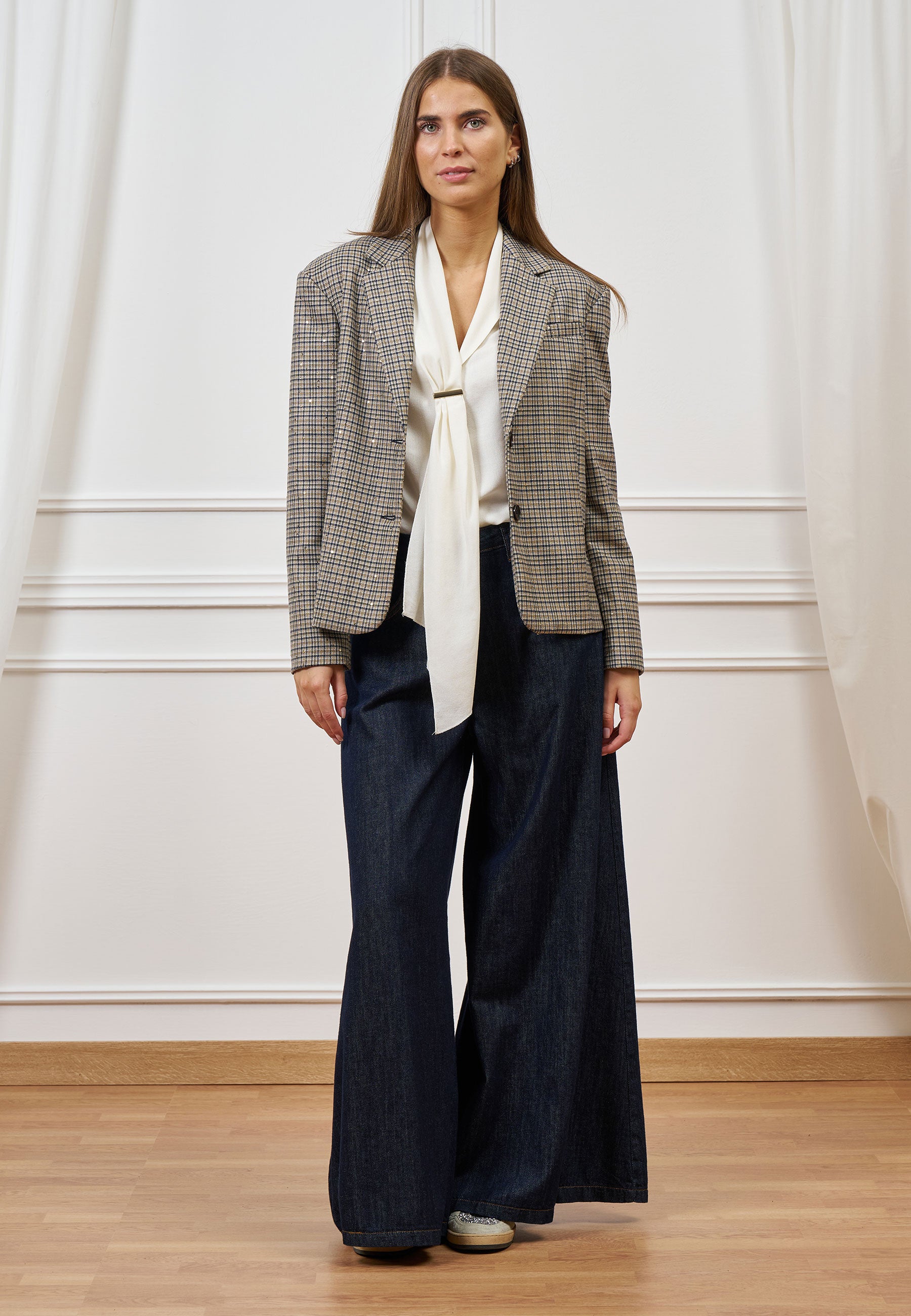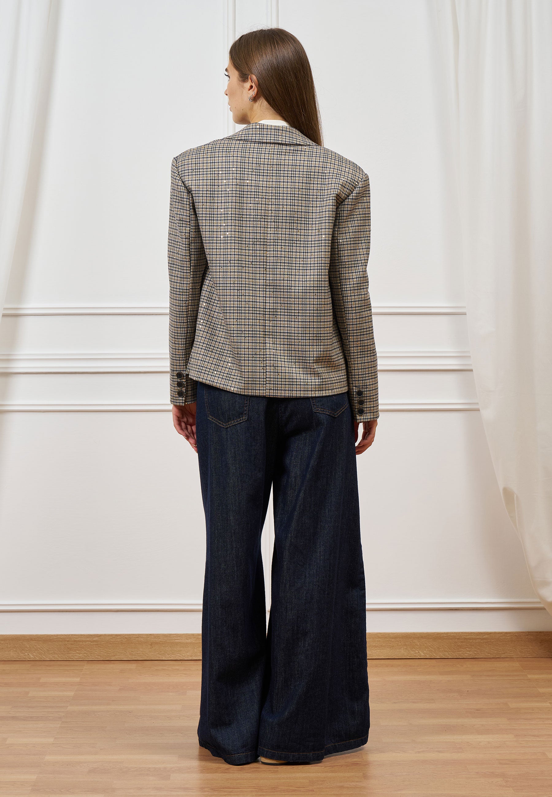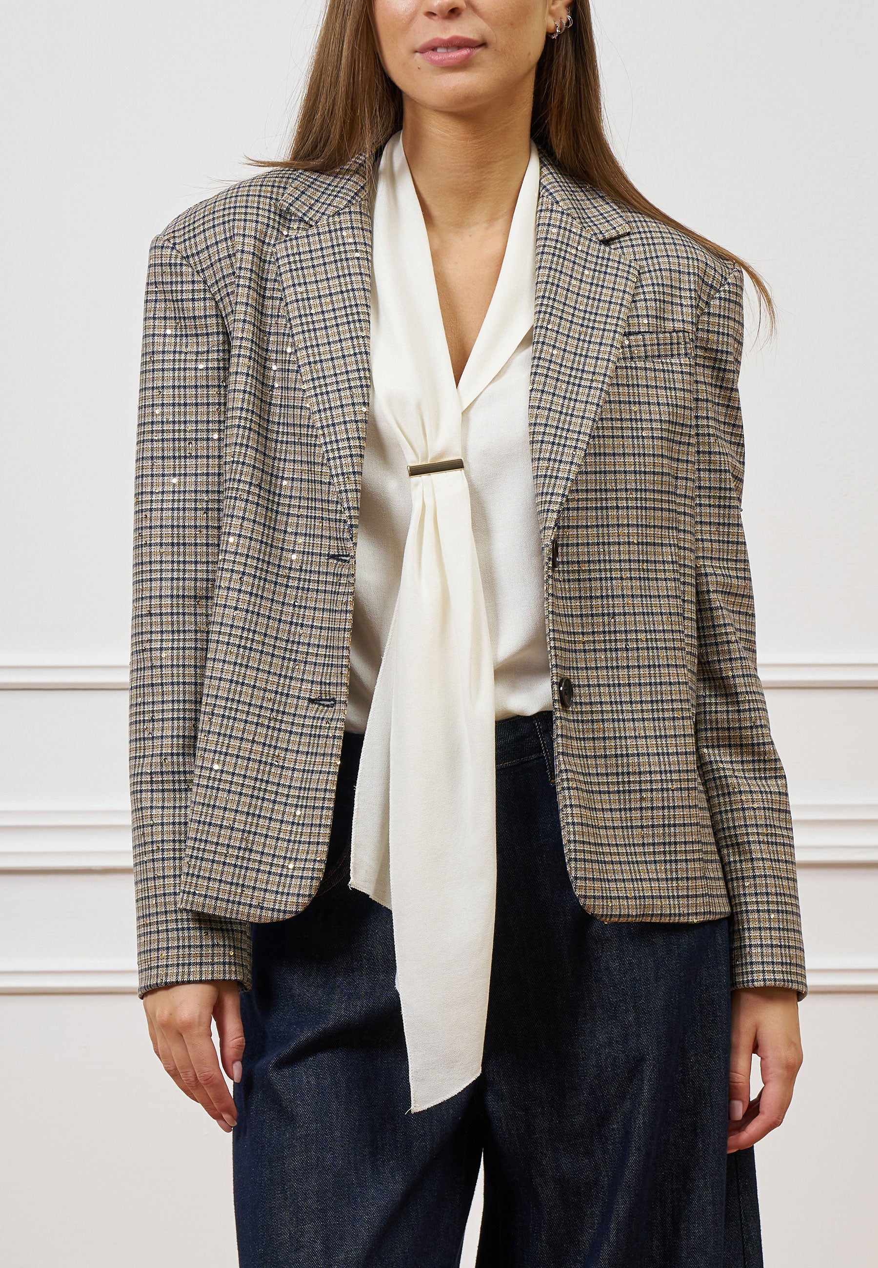 Eleganza e comfort si incontrano in questa giacca a quadri, impreziosita da micro paillettes dorate.