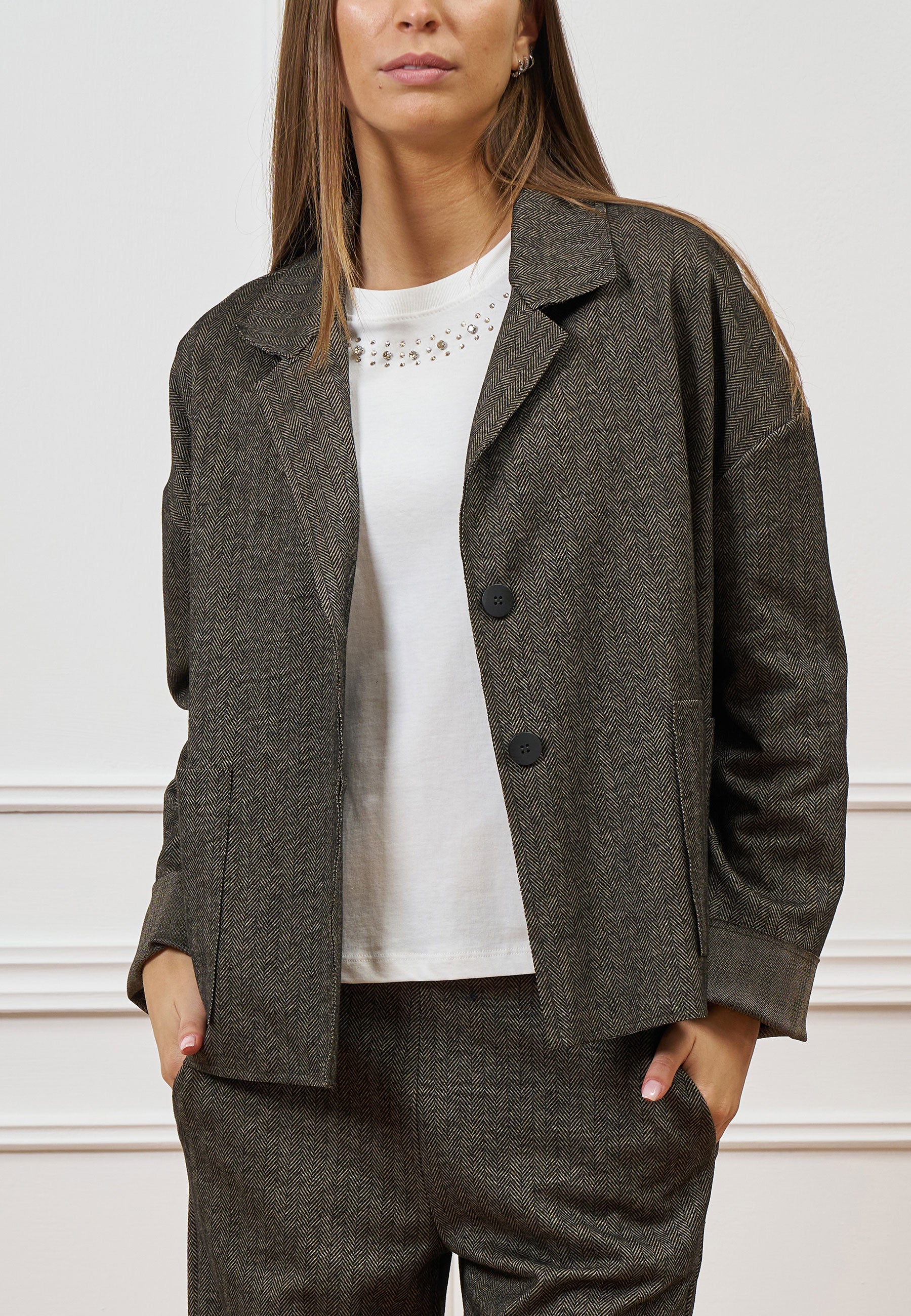 Eleganza e comfort si incontrano in questa giacca destrutturata in jersey a spina di pesce dal design moderno.
