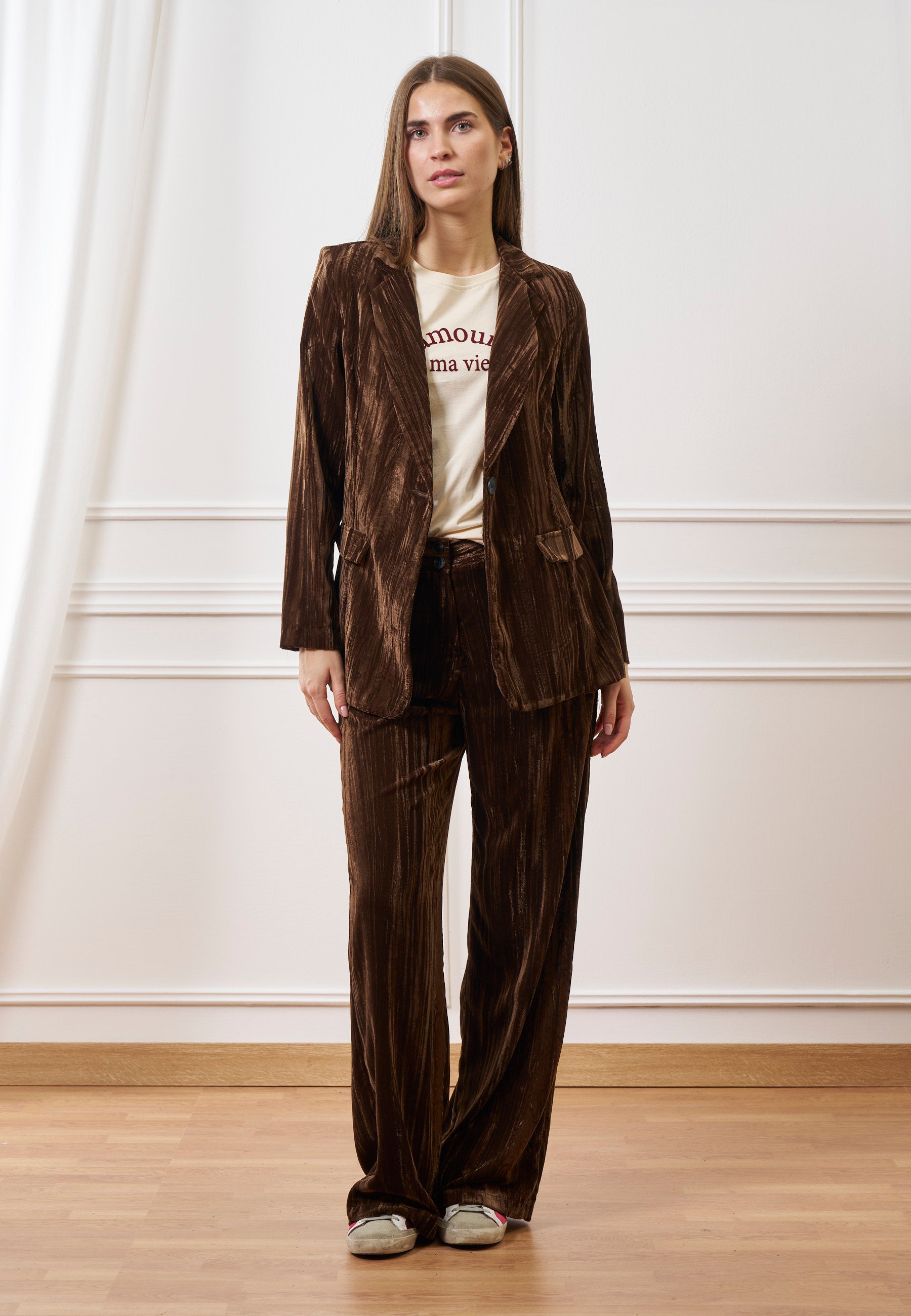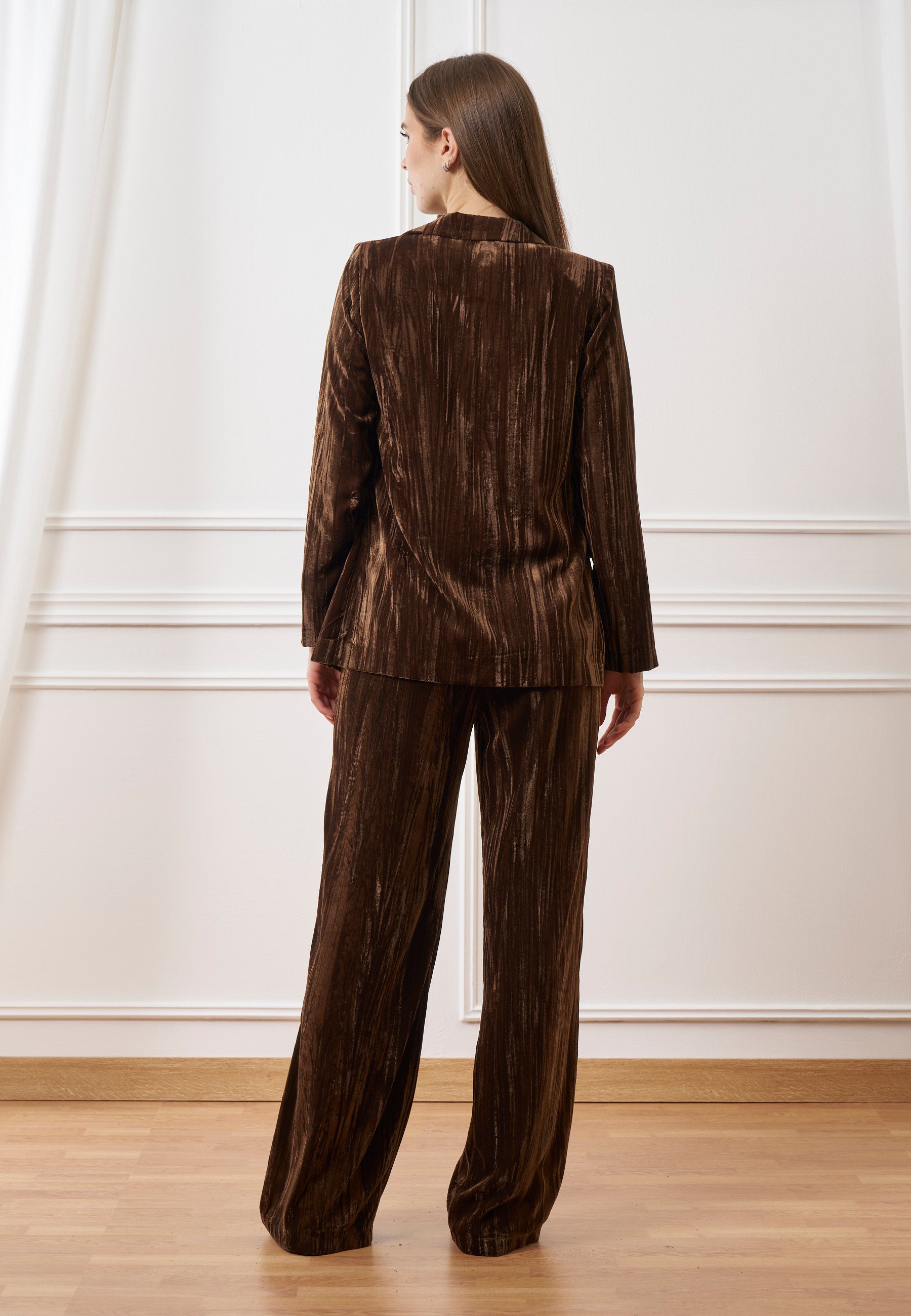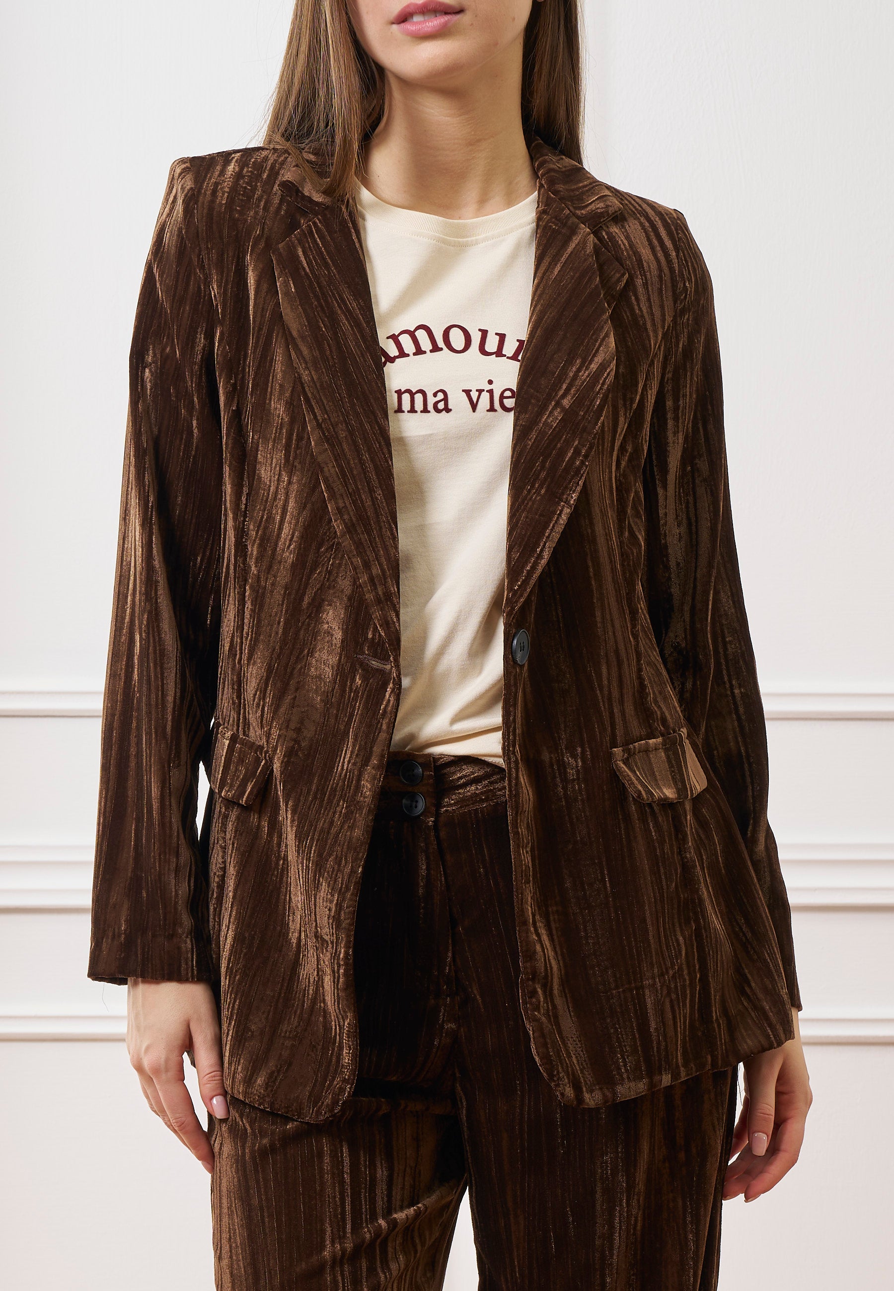 Eleganza e comfort si incontrano in questa giacca monopetto in velluto martellato, caratterizzata da un effetto materico sofisticato che dona carattere a ogni look.