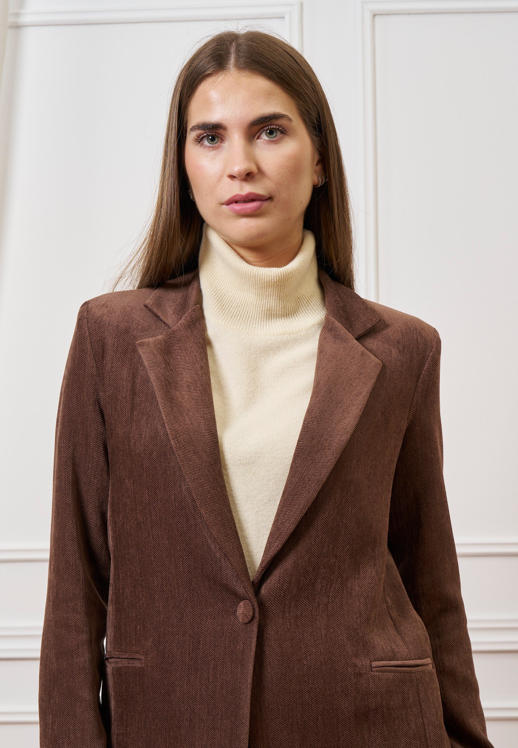 Eleganza e comfort si incontrano in questa giacca monopetto in velluto, dal fascino morbido e sofisticato ideale per completare look contemporanei.