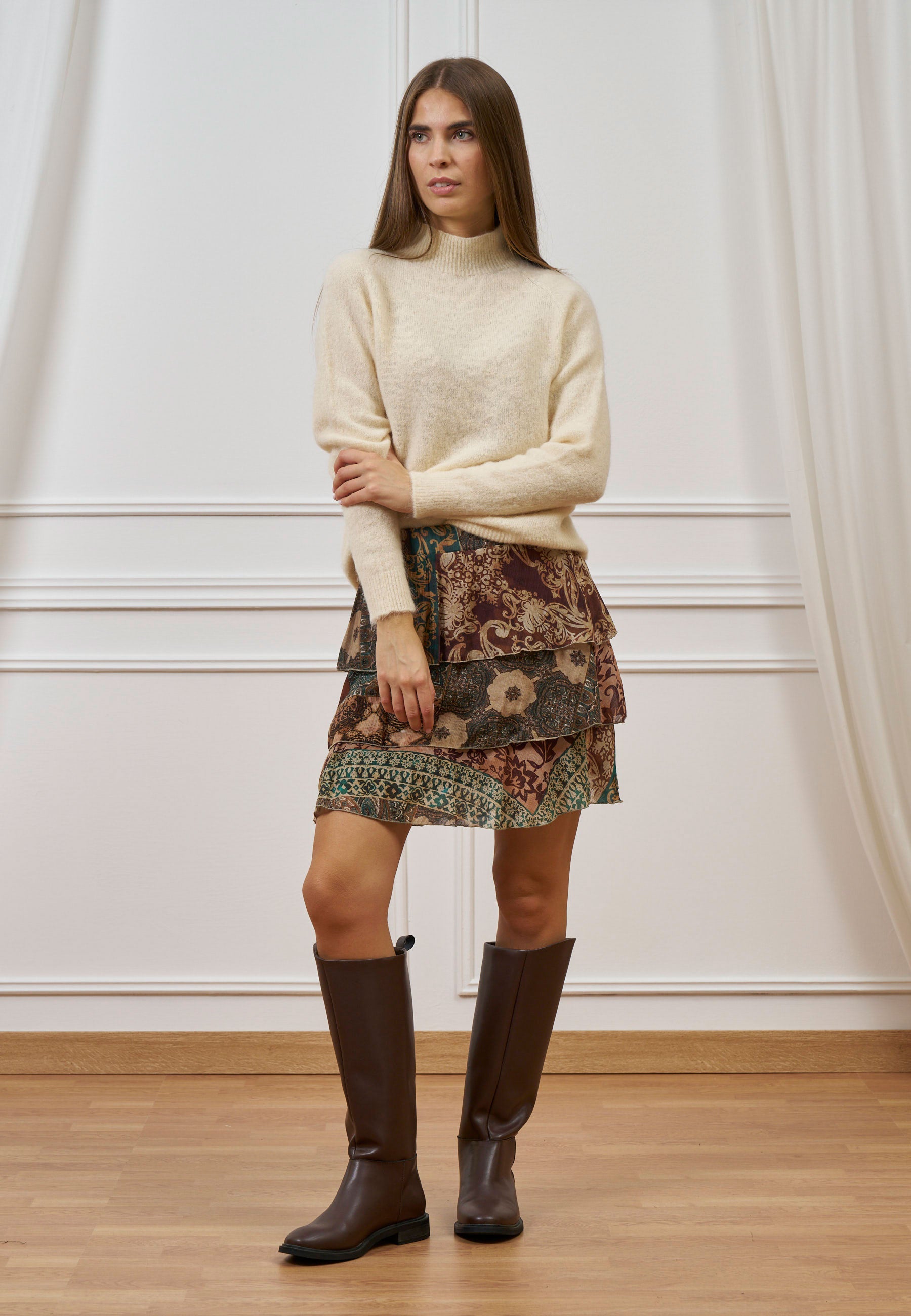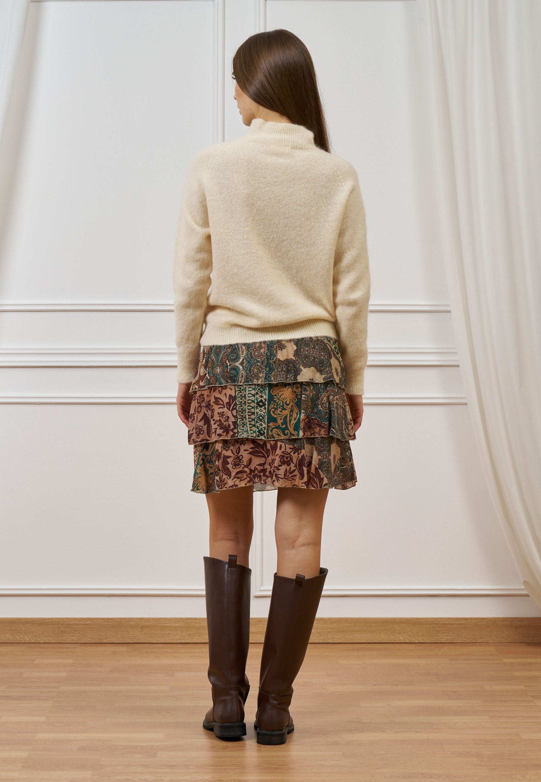 Continua lo shoppingLinee pulite e balze leggere: la gonna corta in fantasia patchwork unisce femminilità e movimento.
