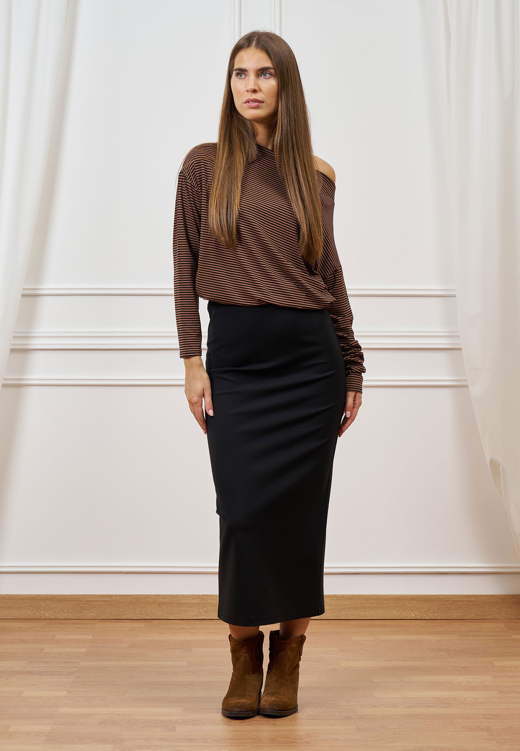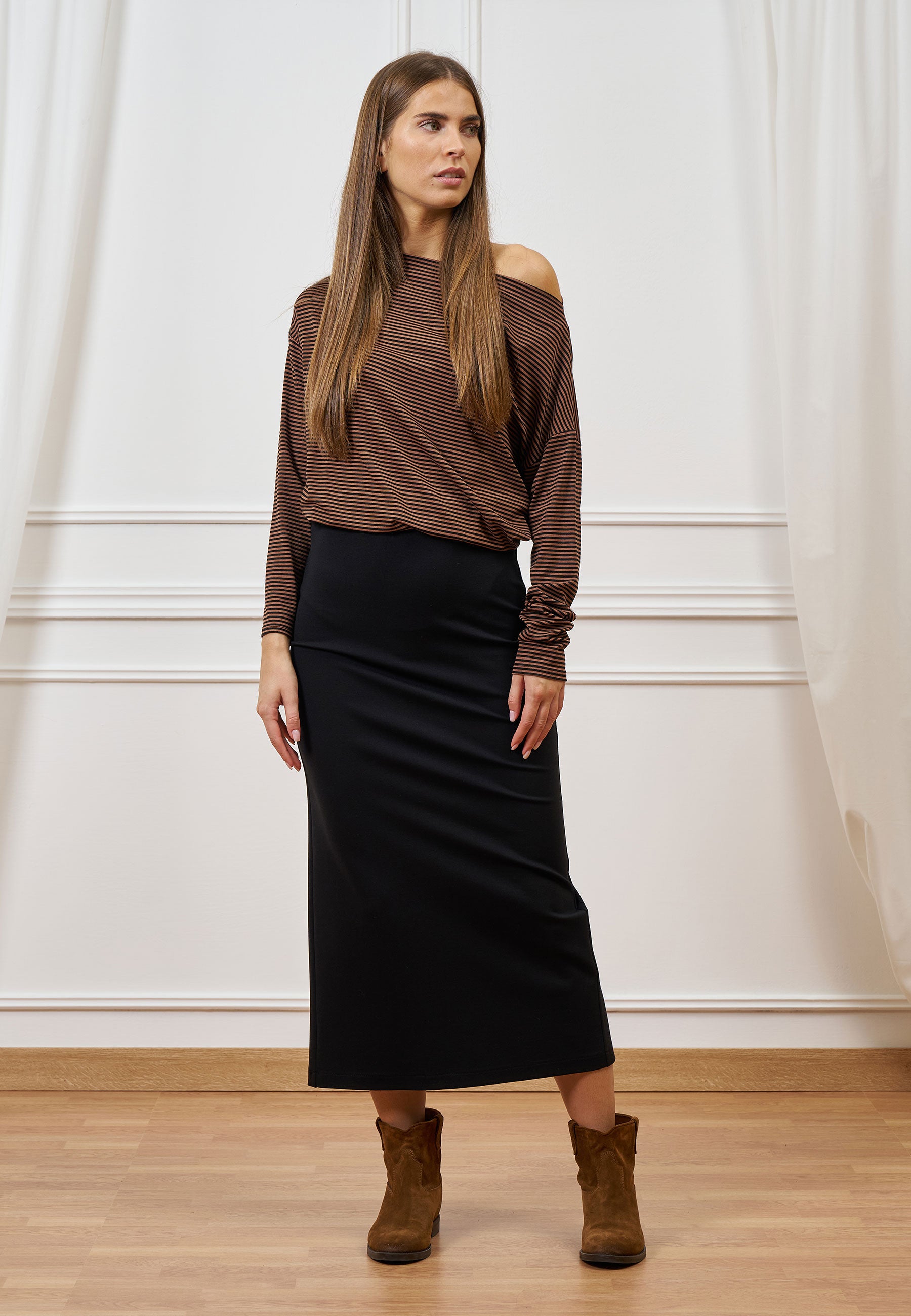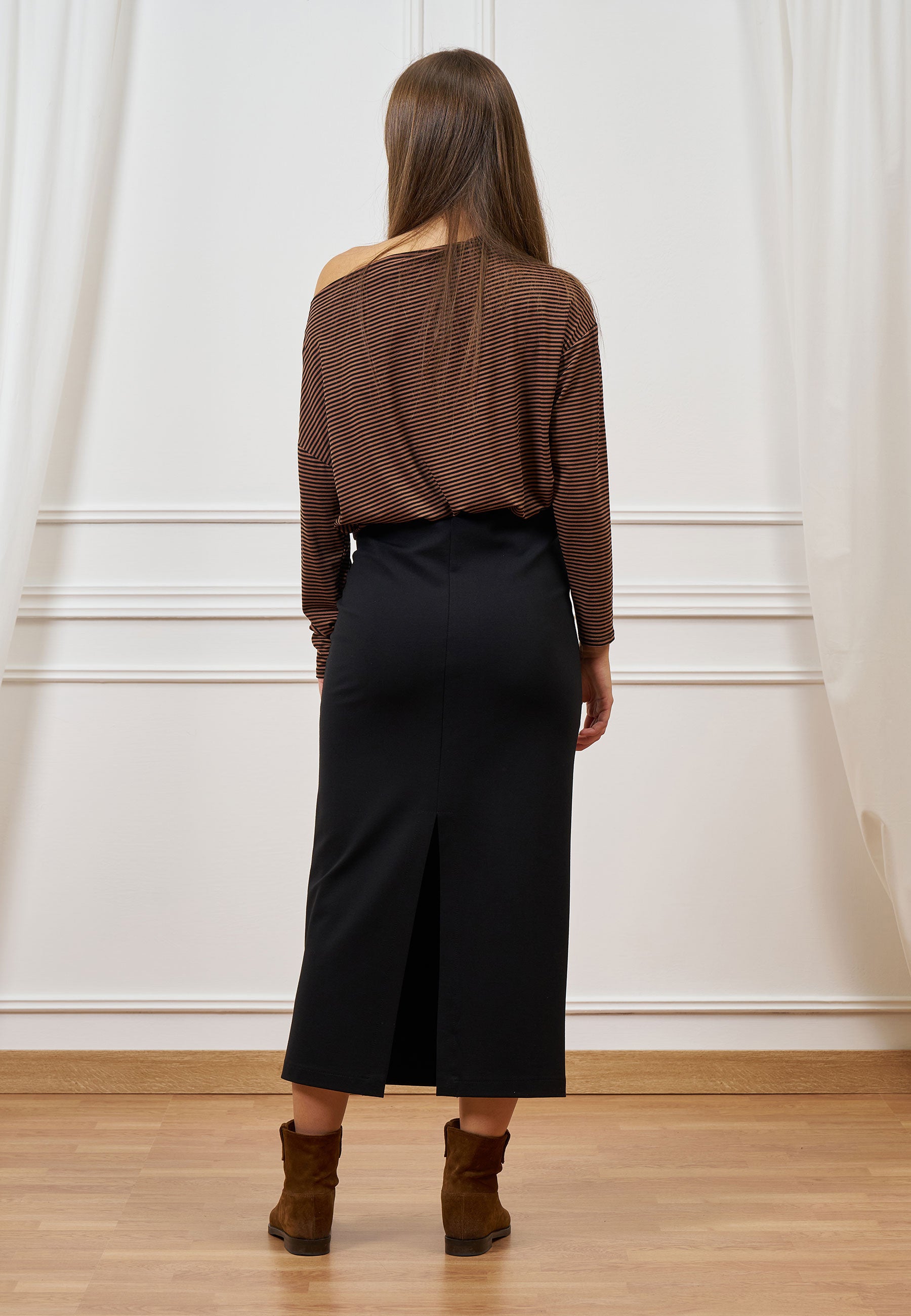 Linee pulite e femminilità si incontrano in una gonna a tubino in jersey, dalla vestibilità avvolgente e confortevole.