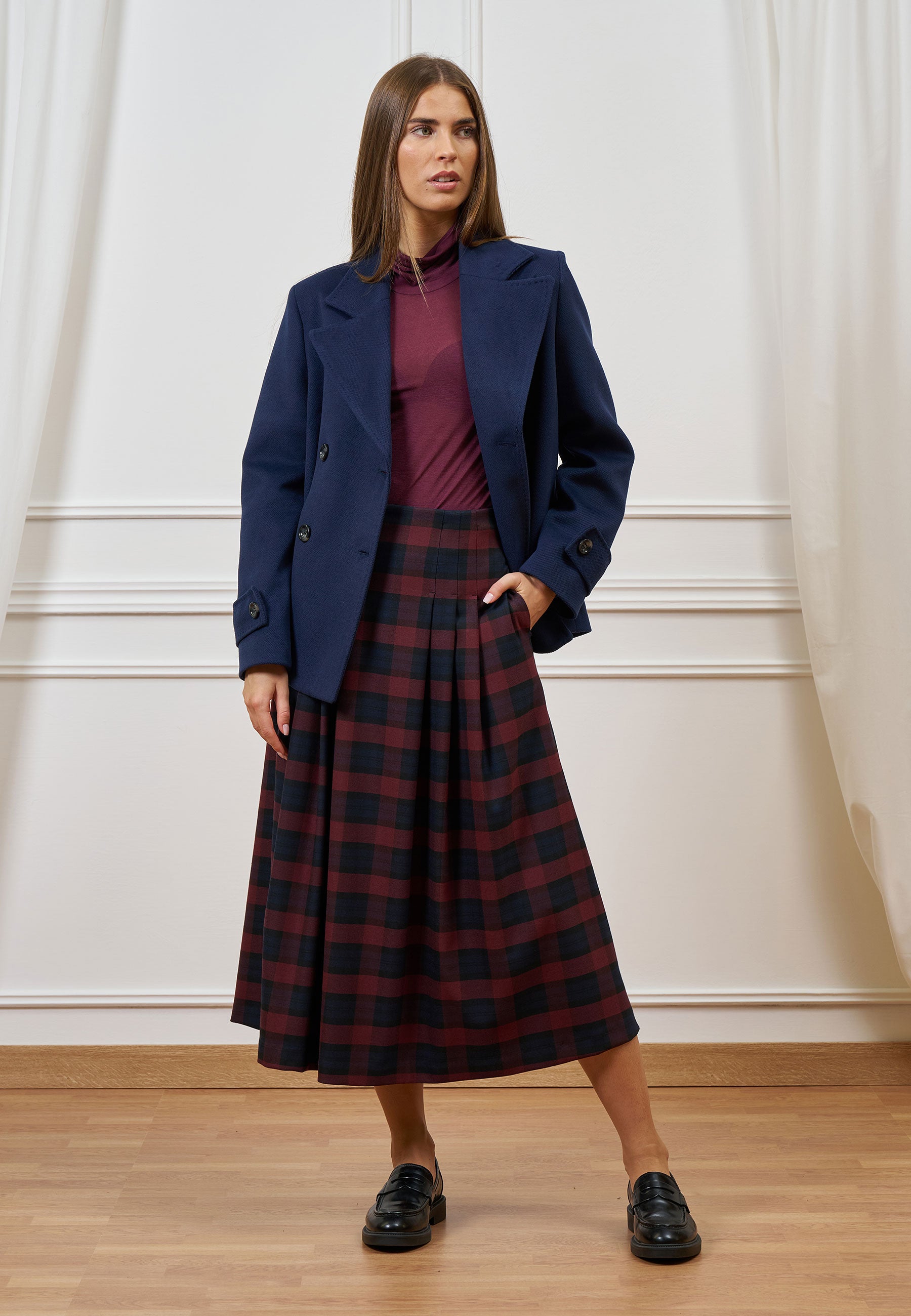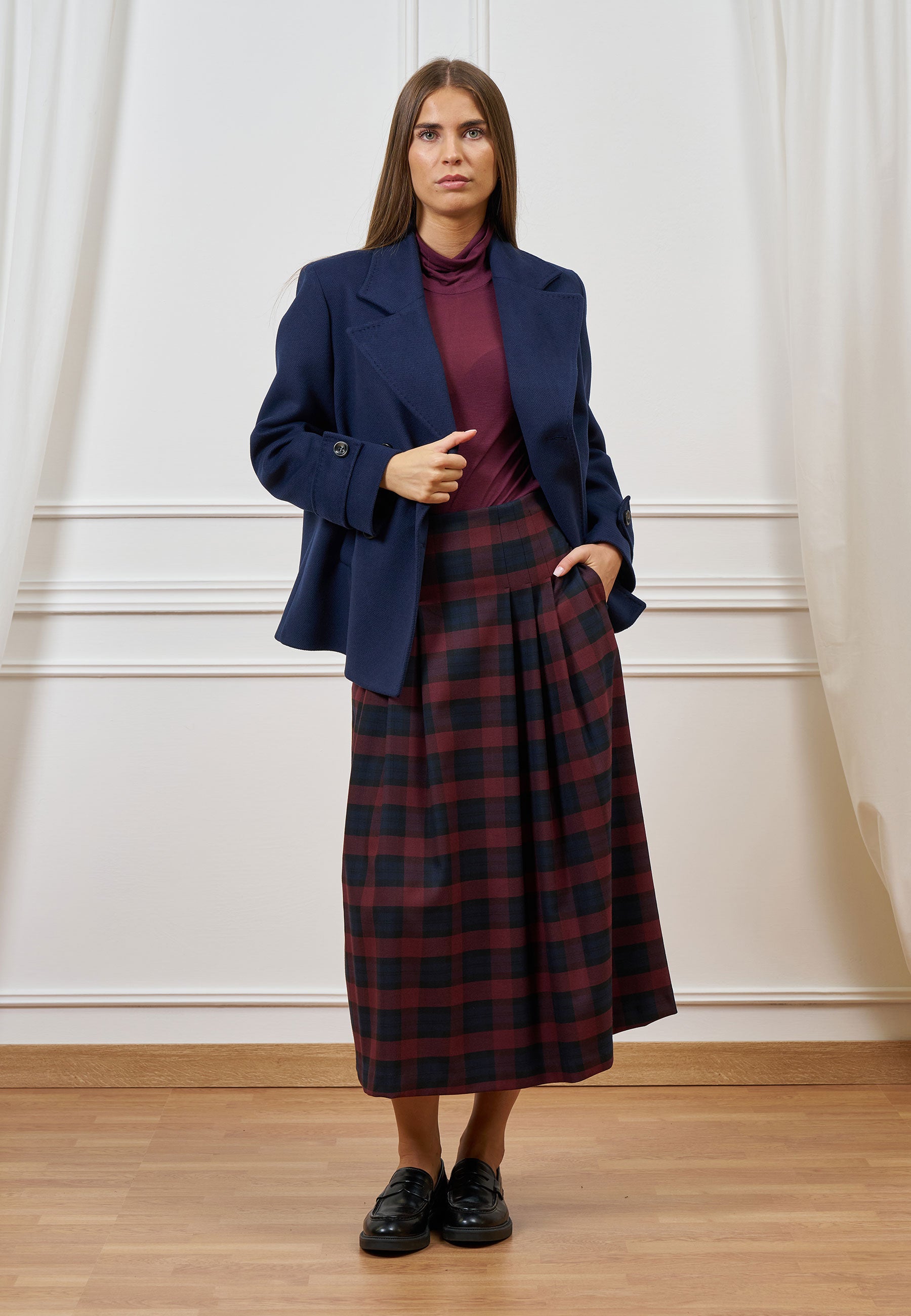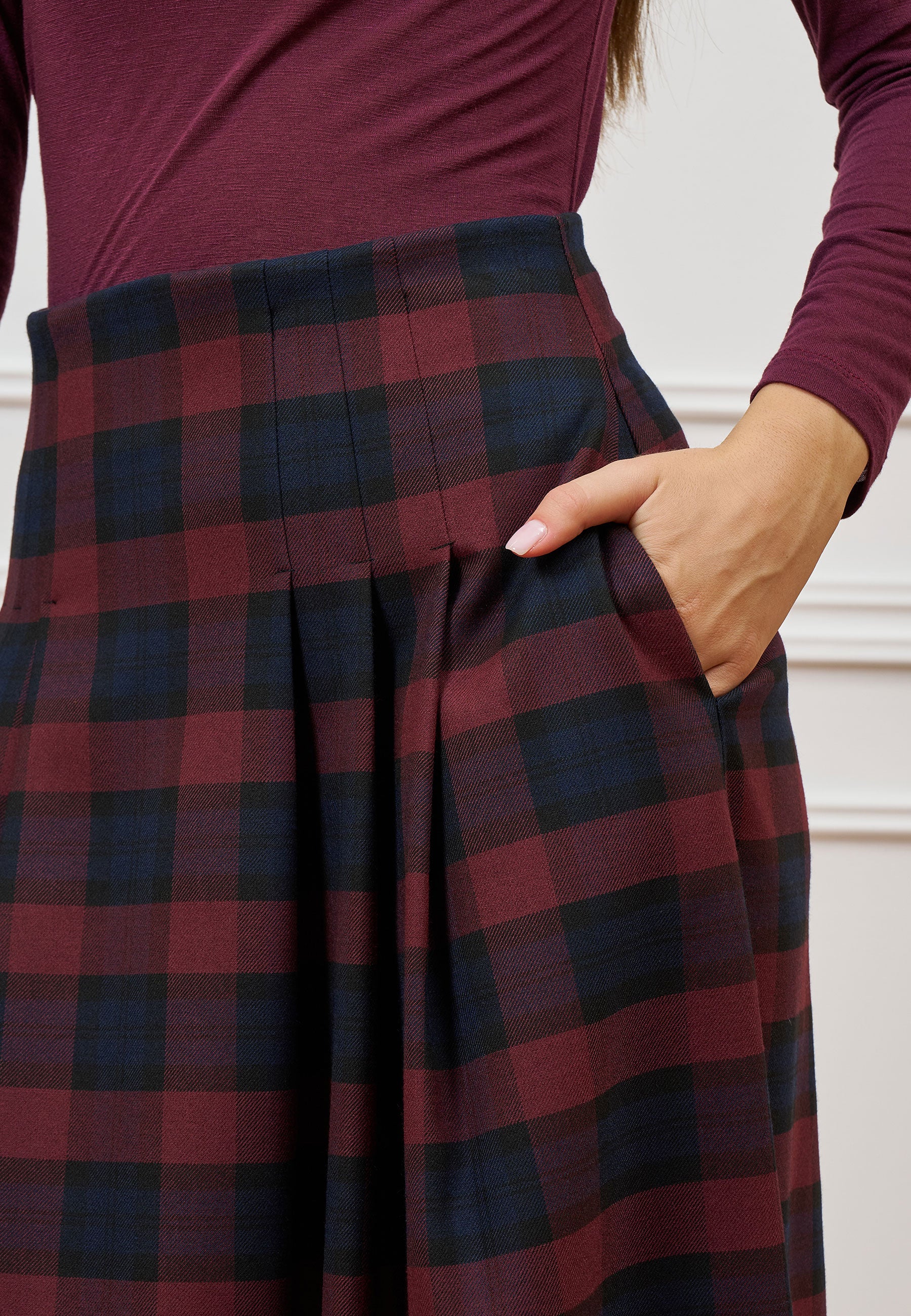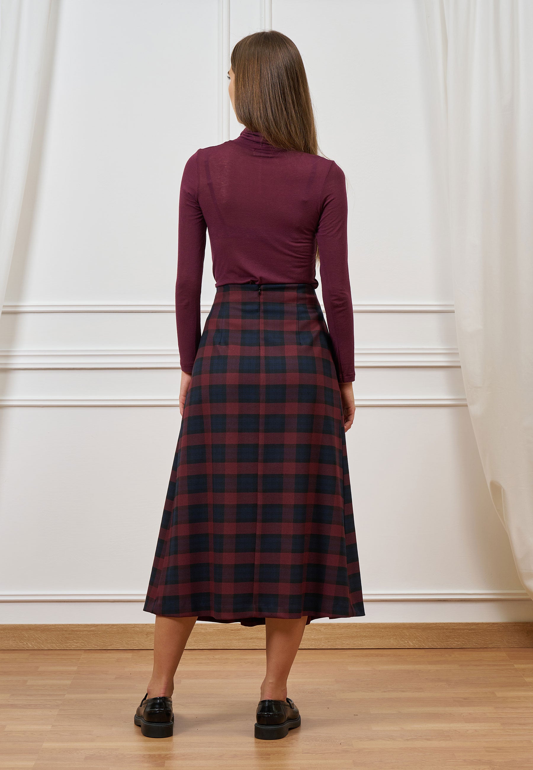 Gonna a ruota con pieghe e fantasia a quadri, un capo di tendenza per la stagione autunnale nei colori moda del momento.