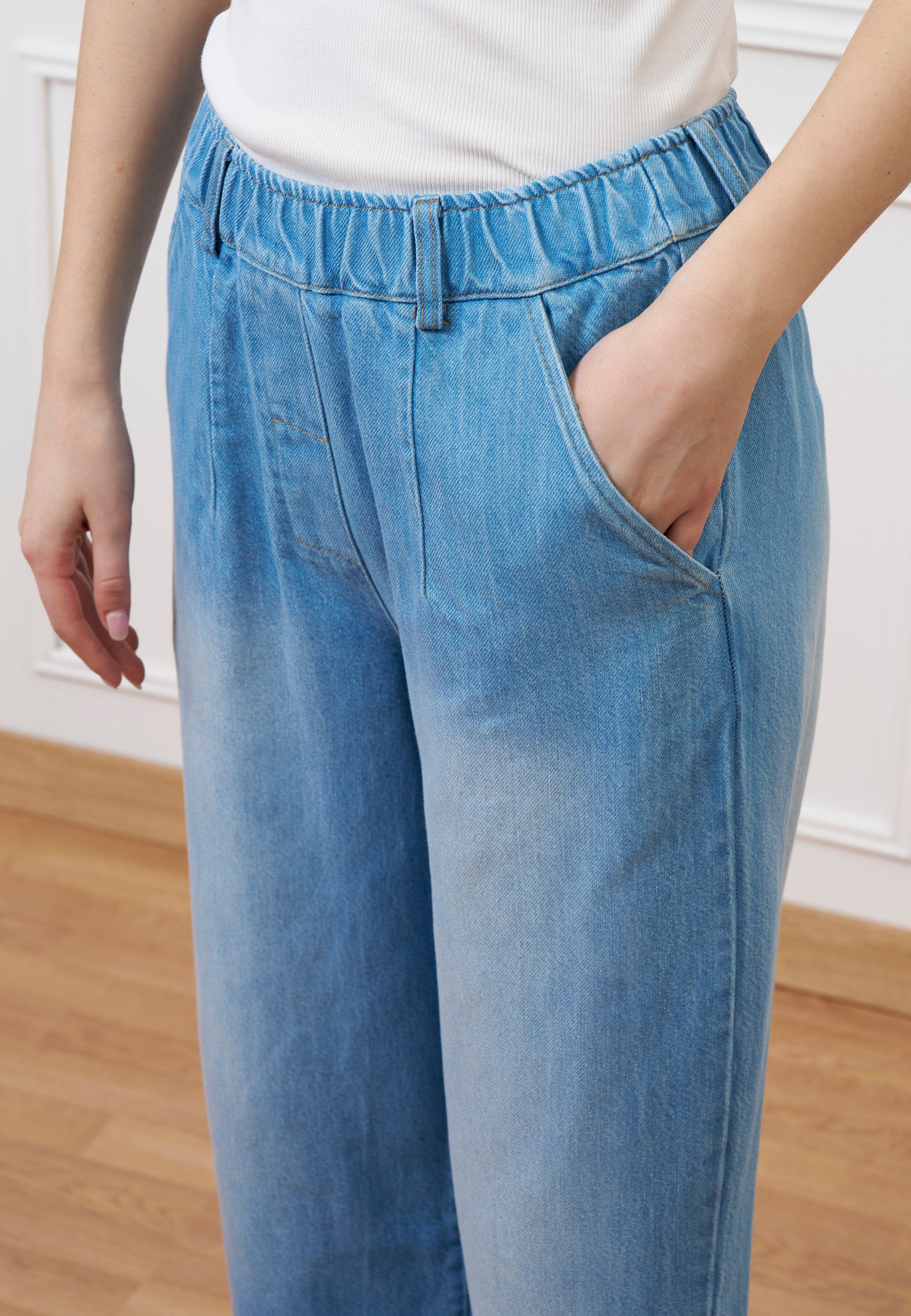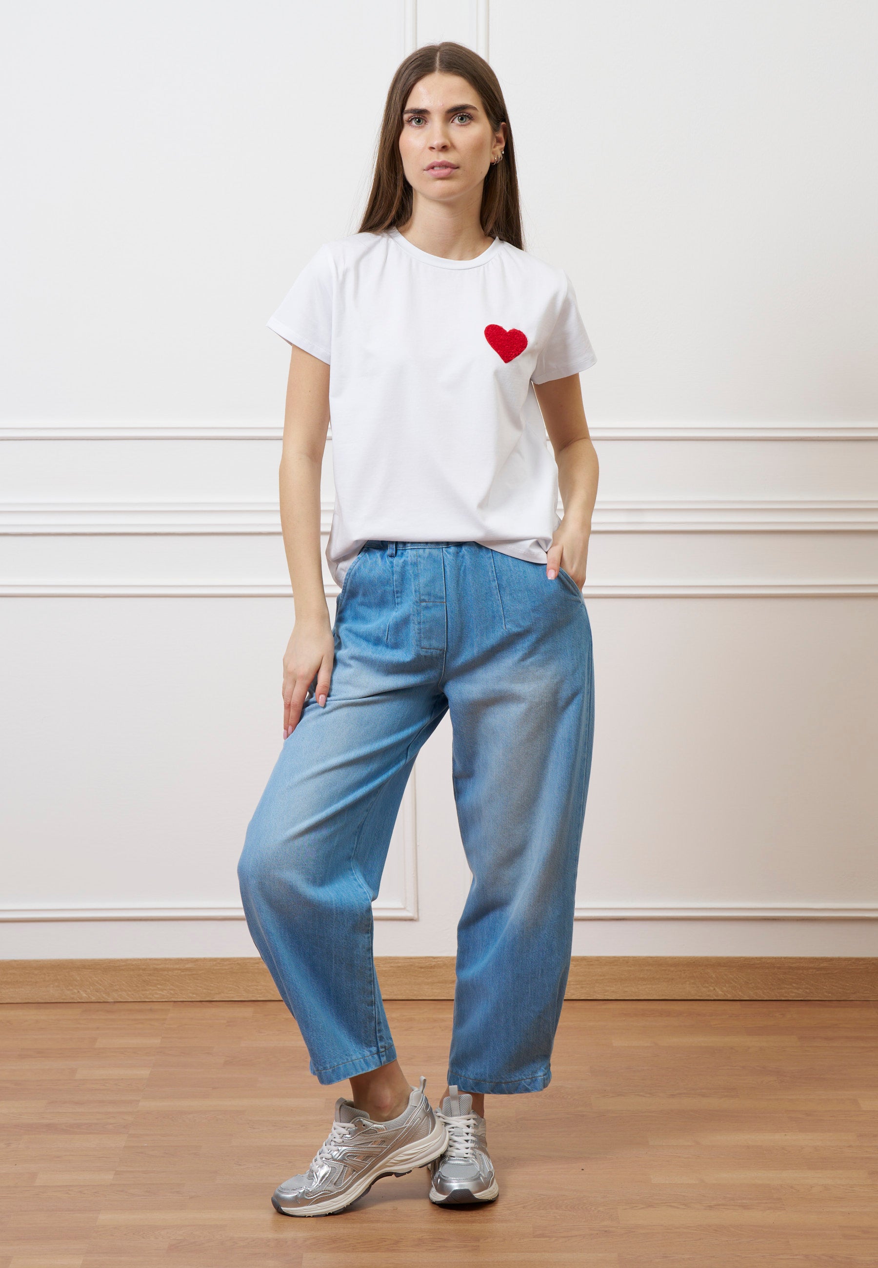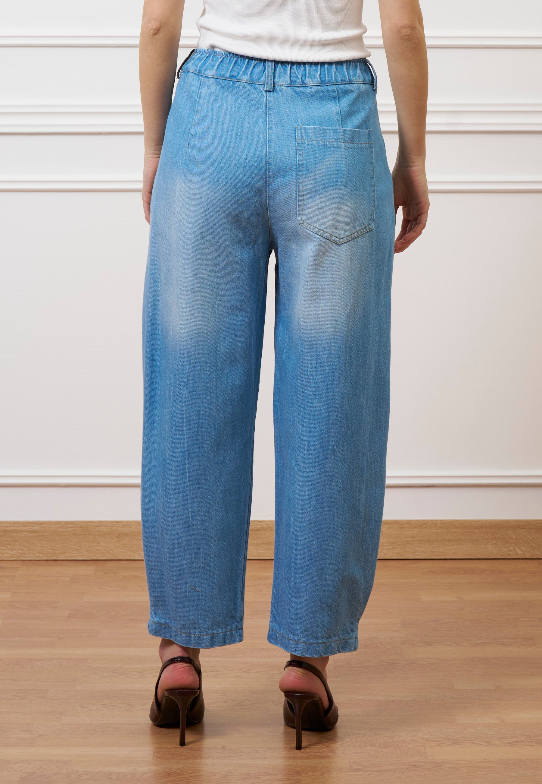 Taglio balloon con pinces sul fondo e vita alta definiscono un jeans essenziale, pensato per unire comfort e stile contemporaneo.