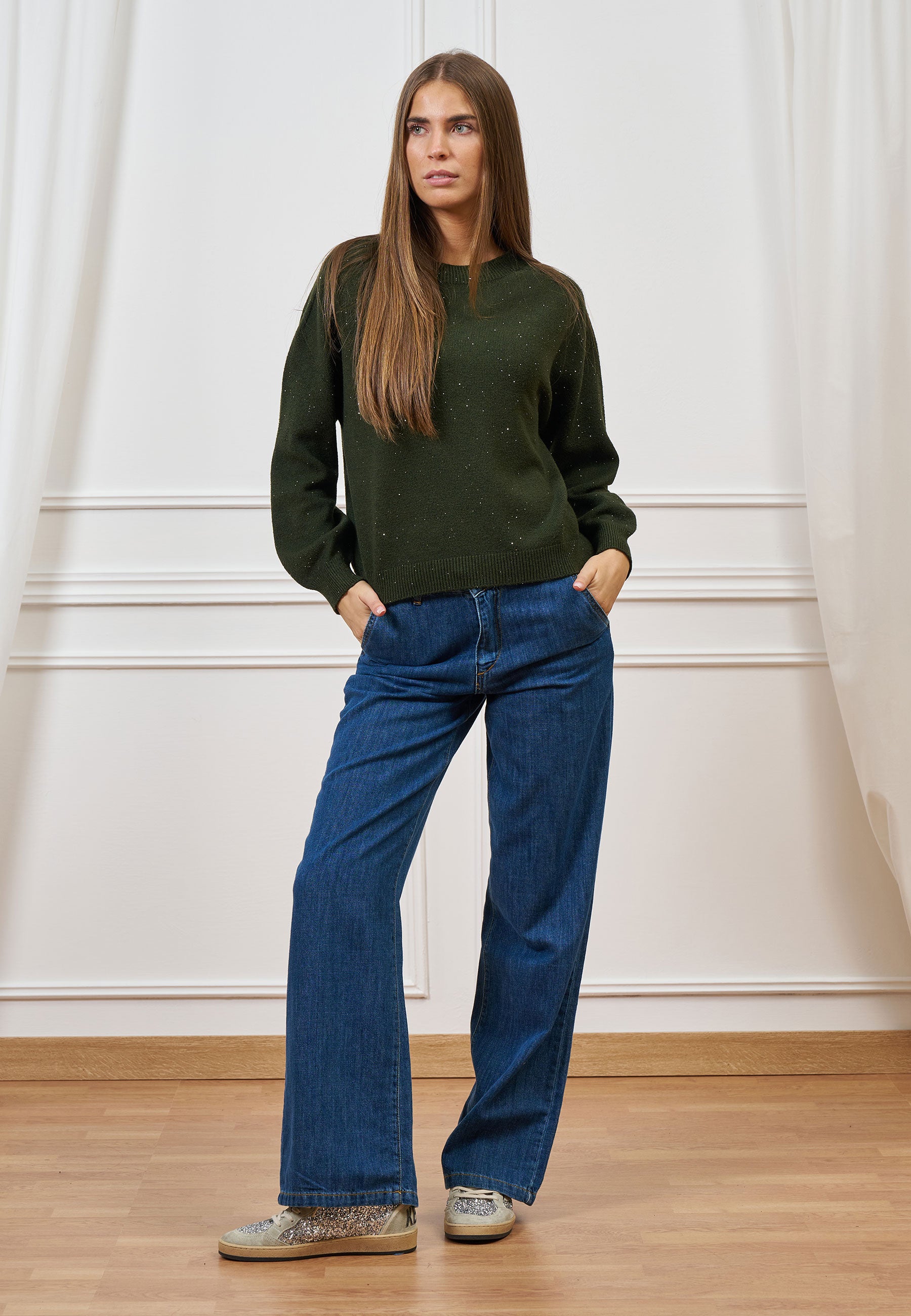 Eleganza e comfort si uniscono in questa maglia dal design delicato e femminile, impreziosita da micro paillettes che donano luminosità ai tuoi look.