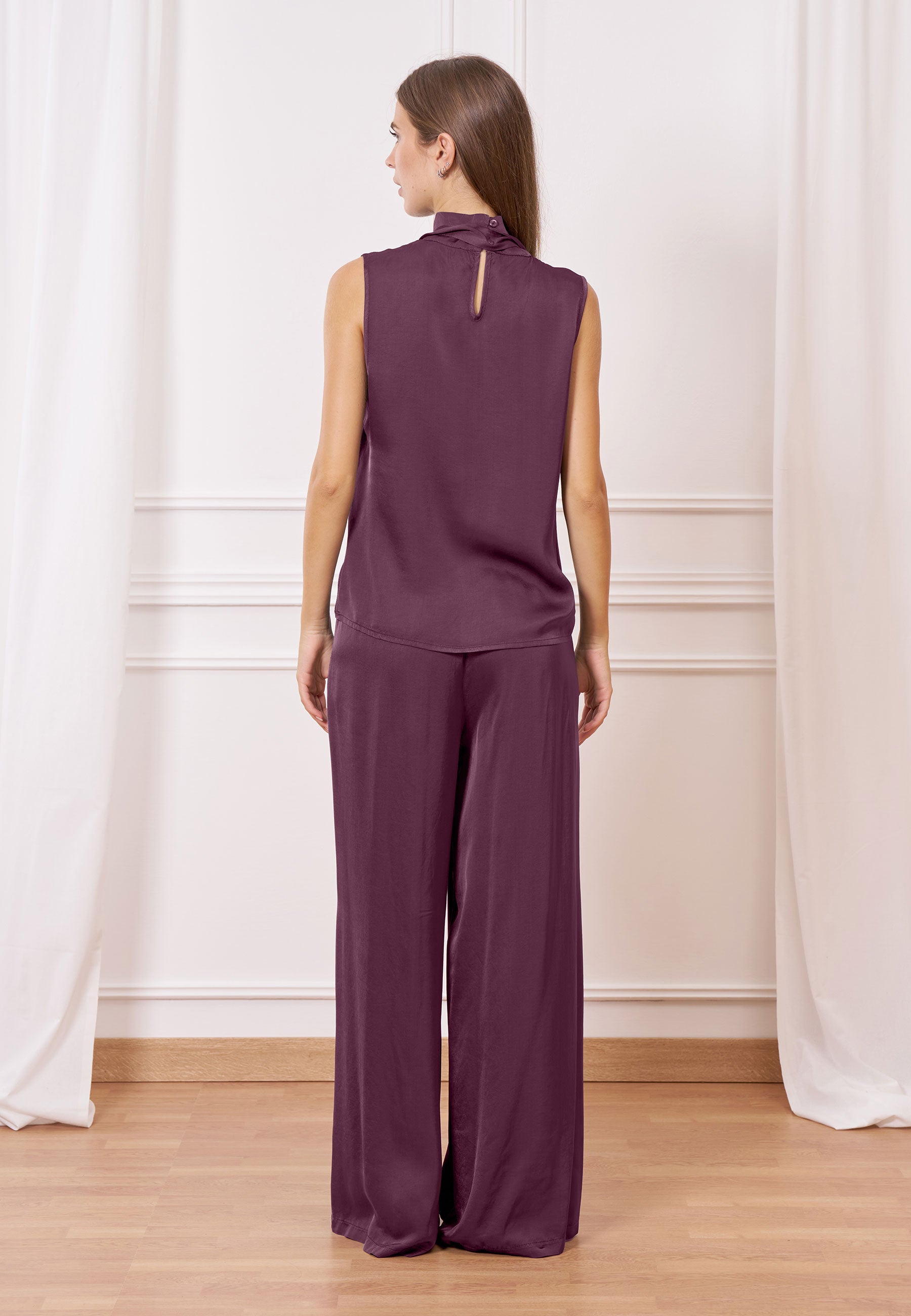 Lucentezza delicata e linea ampia: il pantalone in raso scivola morbido, per un look elegante e raffinato.