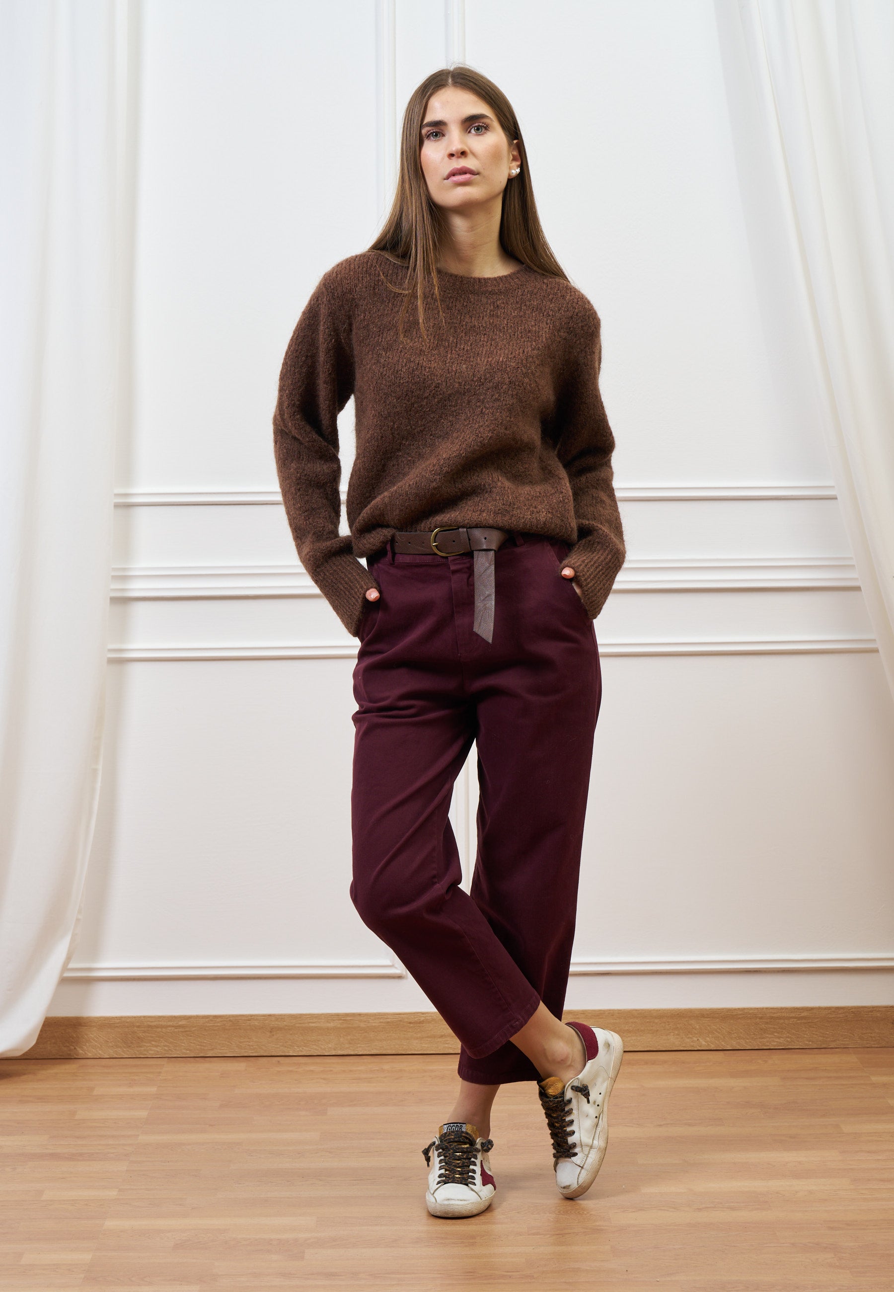 Il pantalone balloon, trend di stagione, unisce stile e comfort grazie al suo volume e al tessuto effetto mano pesca.