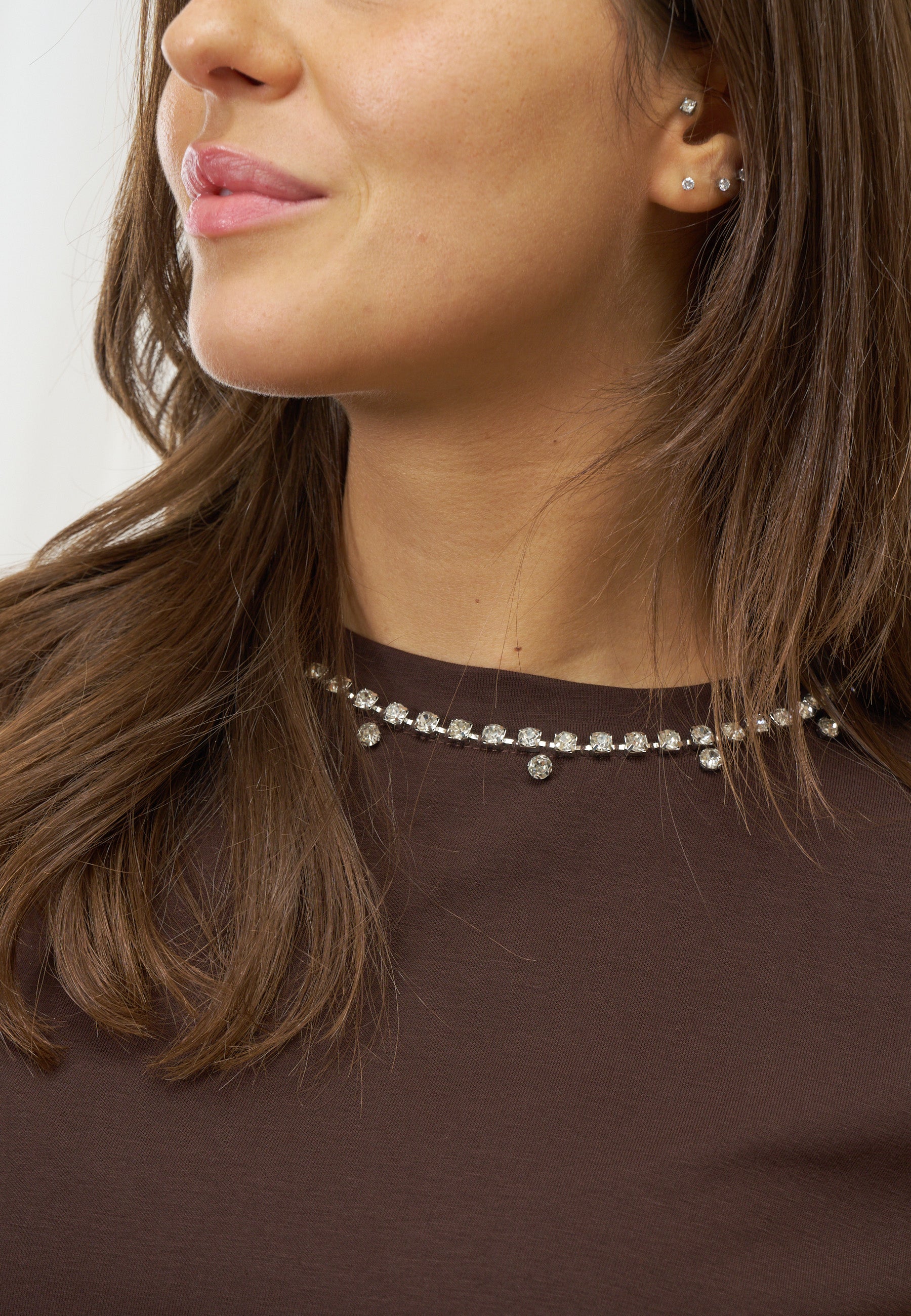 Unicità e comfort si incontrano in questa t-shirt dal design contemporaneo, impreziosita da castoni decorativi che illuminano il viso.