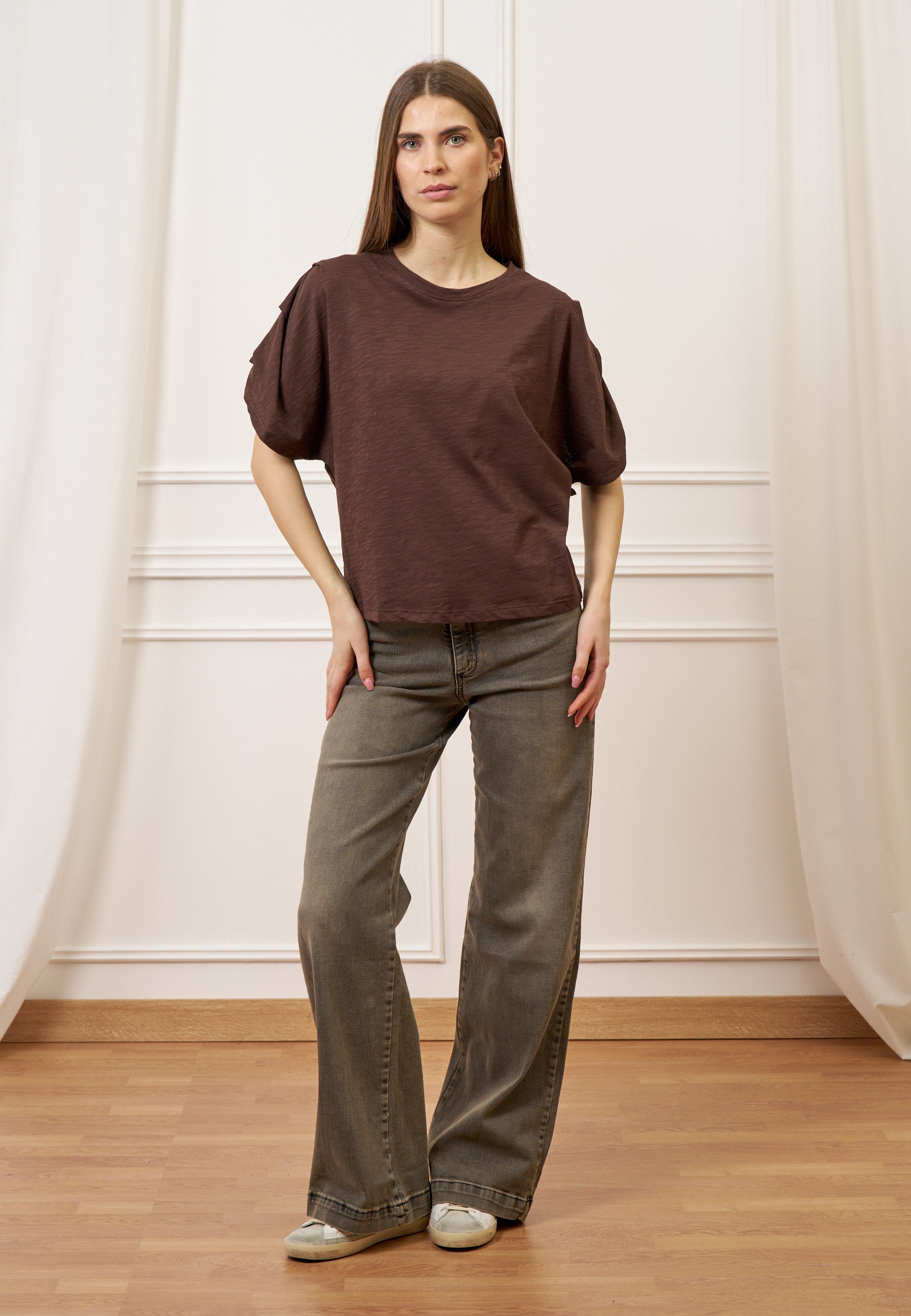 T-shirt con pieghe maniche - MARRONE