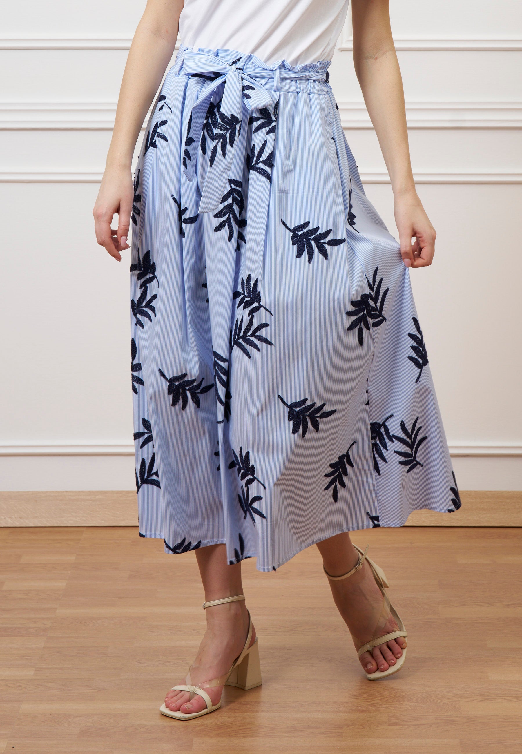 Parte superiore in jersey e gonna lunga a righe con ricami di foglie 3D definiscono un abito dal carattere ricercato.