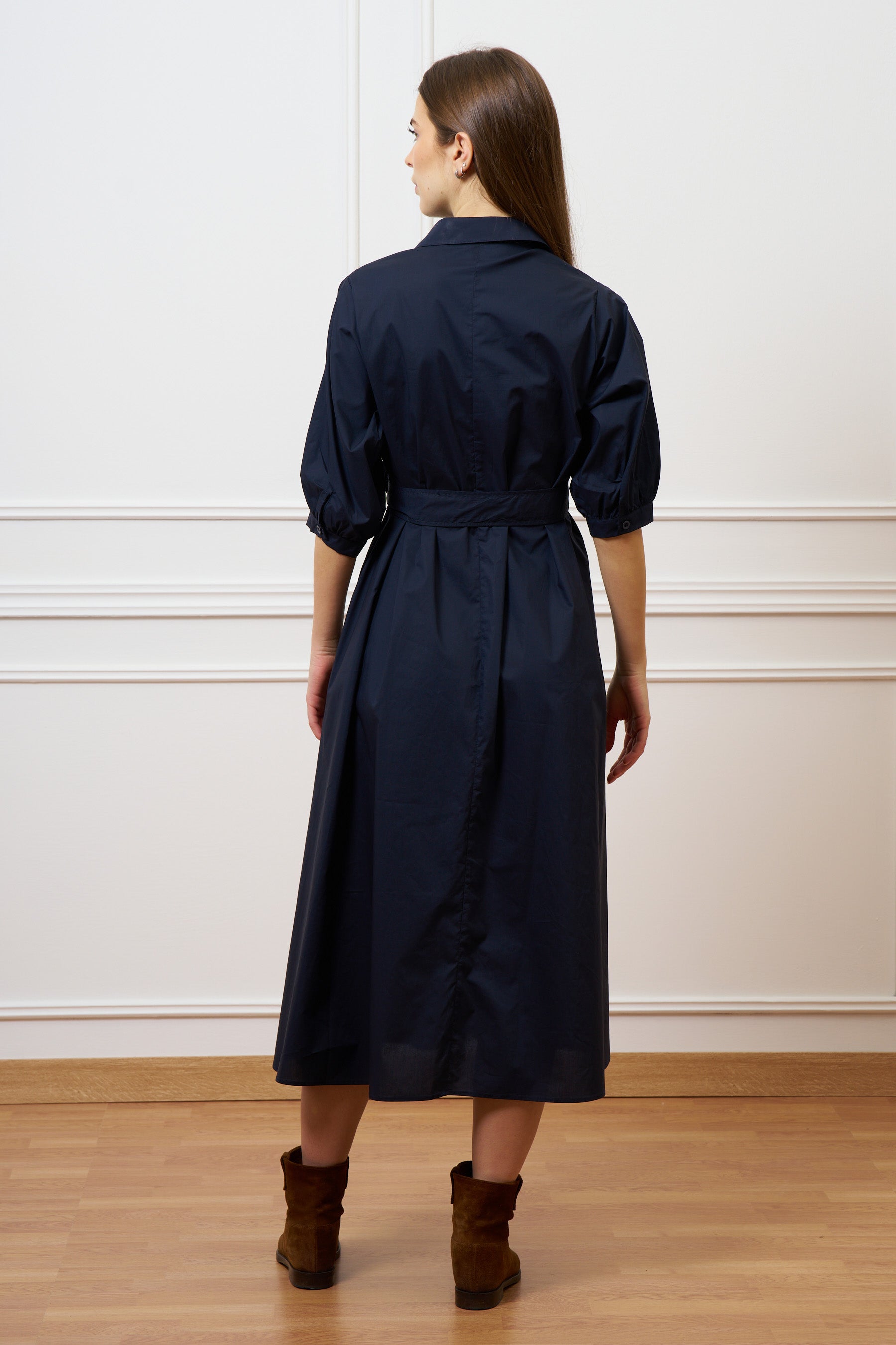Linee pulite e costruzione leggera definiscono un abito lungo in popeline, pensato per seguire il movimento con naturalezza durante la giornata.