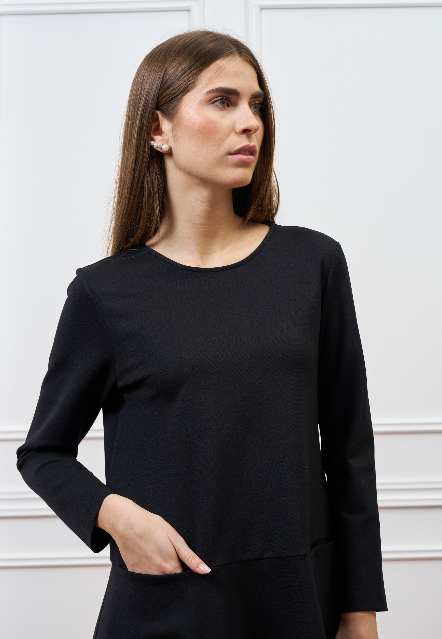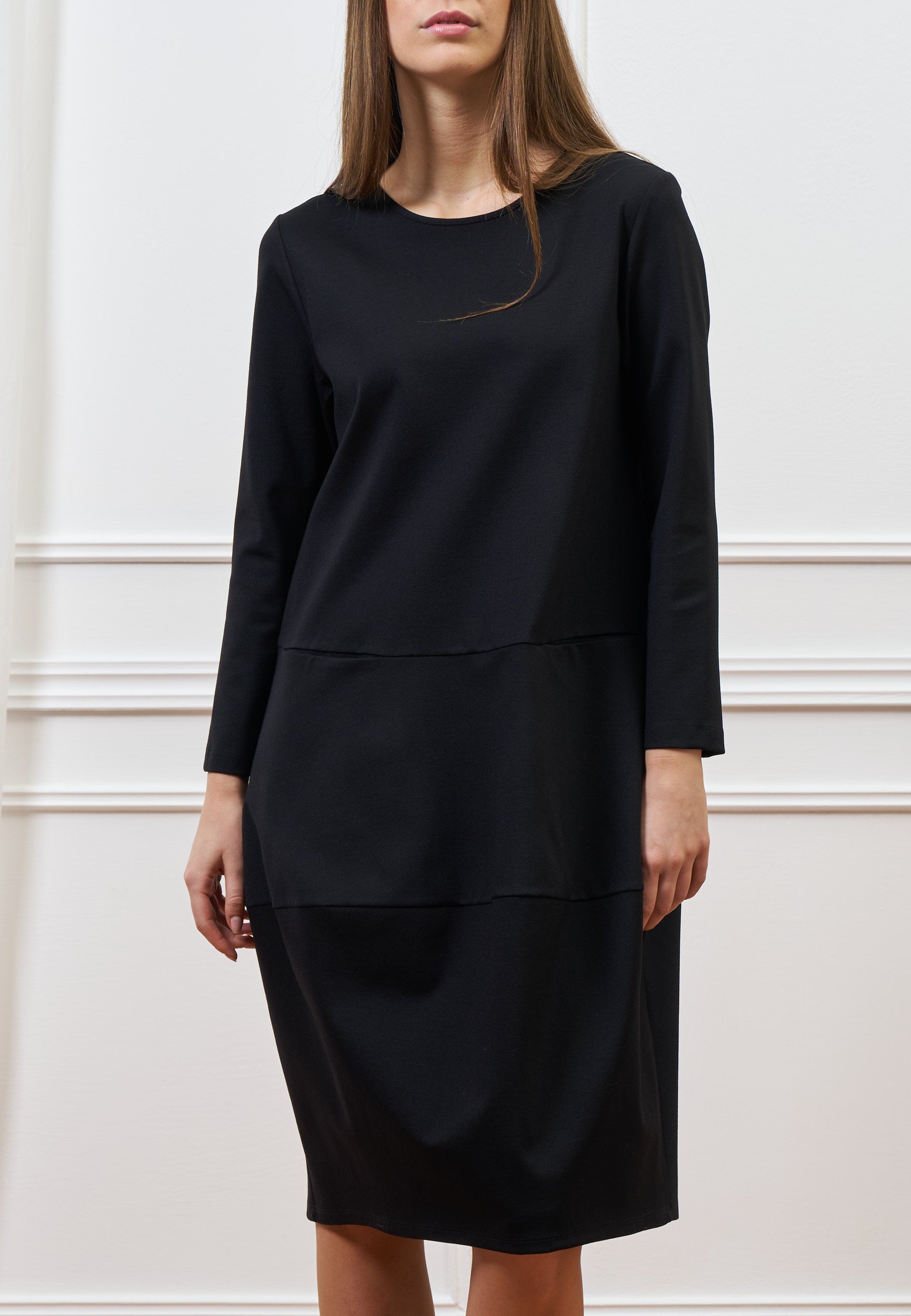 Ispirato alle linee essenziali dello stile giapponese, questo abito in punto milano unisce pulizia formale e morbidezza, avvolgendo la silhouette con eleganza naturale.